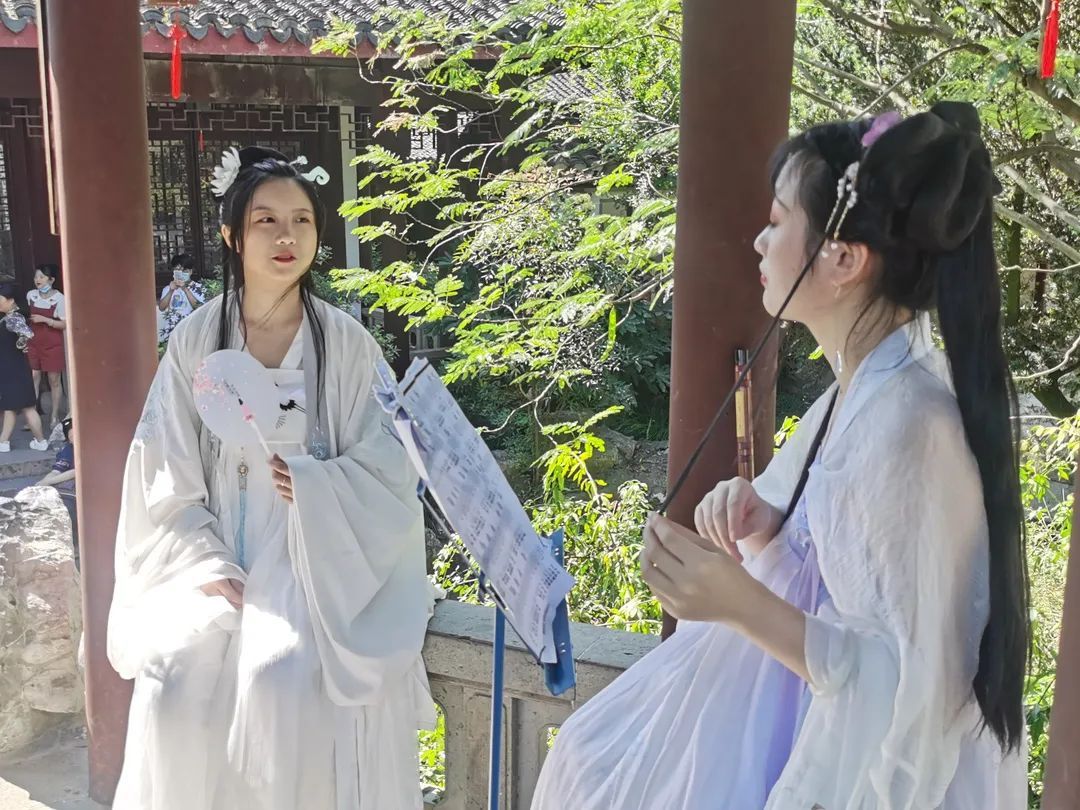 今年大观园的国庆活动以古装扮相和情景演绎为主,在怡红院邀月亭聆听悠扬的笛声;在通灵书房欣赏宝黛二人共读西厢;在潇湘馆感受“黛玉抚琴”知音难觅的寂寥......