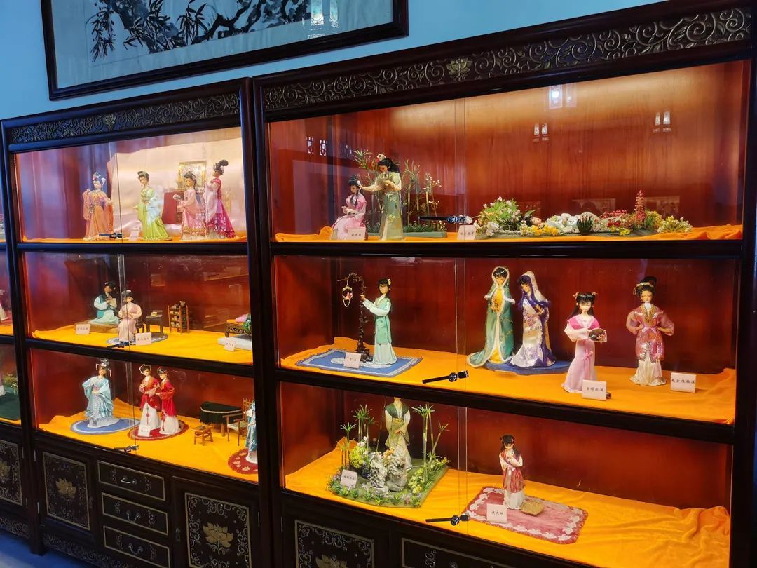 此外,在大观园的书斋内还陈列着金丽人女士捐赠的《红楼梦》娟人彩扎作品,将黛玉葬花、宝钗扑蝶、可卿春困等经典场景刻画得栩栩如生,可供游客休憩的片刻时驻足欣赏。