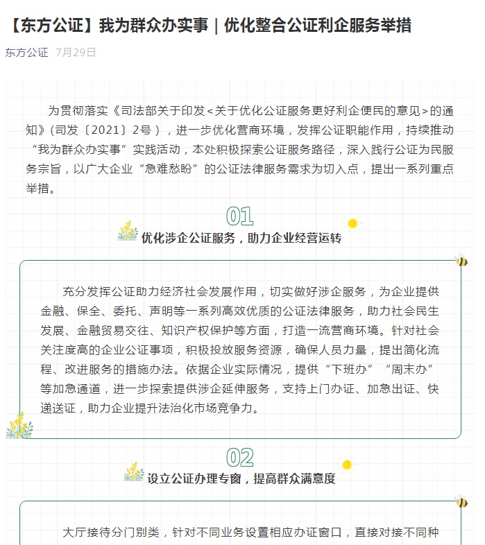 7月29日,为贯彻落实《司法部关于印发<关于优化公证服务更好利企便民的意见>的通知》(司发〔2021〕2号),进一步优化营商环境,优化整合公证利企8项服务举措,提升企业办证体验感。