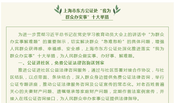 为进一步发挥公证职能作用,更好利企便民,切实解决人民群众“急难愁盼”问题,东方公证处坚持“以人民为中心”,积极探索公证服务利企便民新路径,持续推进“我为群众办实事”实践活动,全面动员部署,细化工作举措,强化组织领导,多措并举,切实为群众办好事、做实事、解难事。