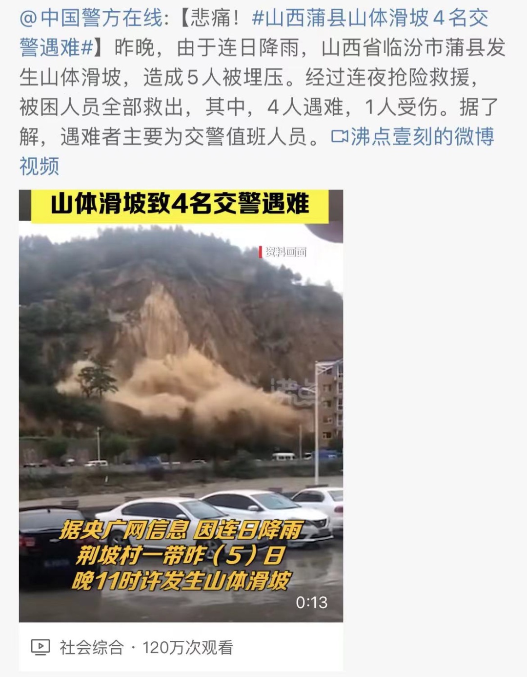 当天晚11时,山西省蒲县荆坡村一带发生山体滑坡,造成5人被埋压。其中,4人遇难,1人受伤。据了解,遇难者主要为交警值班人员。