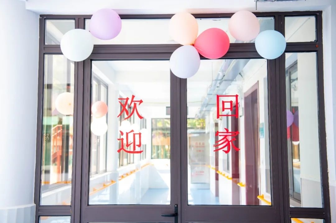 为了让老人感受到“回家”的温馨,敬老院的护理员们提前一天就布置好了院内的环境。干净的大门上早早贴好了“欢迎回家”四个大字,窗户上也扎满了彩色气球……