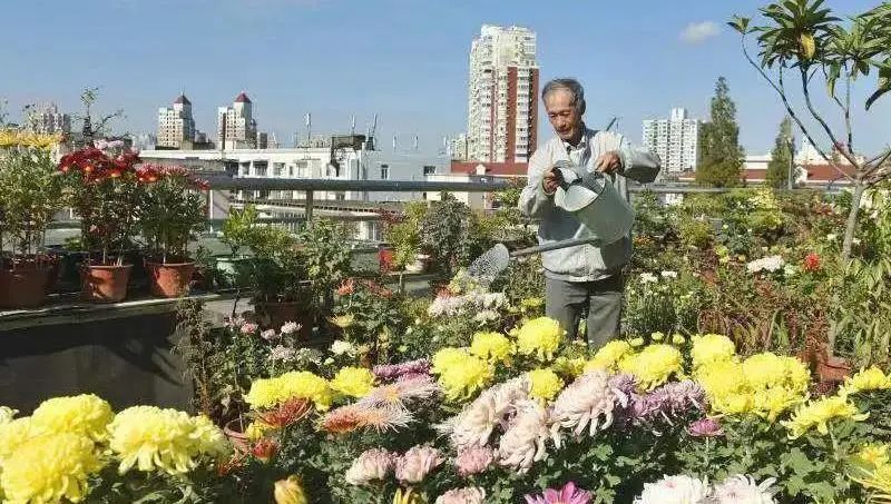 传承人赵张永在屋顶照看菊花