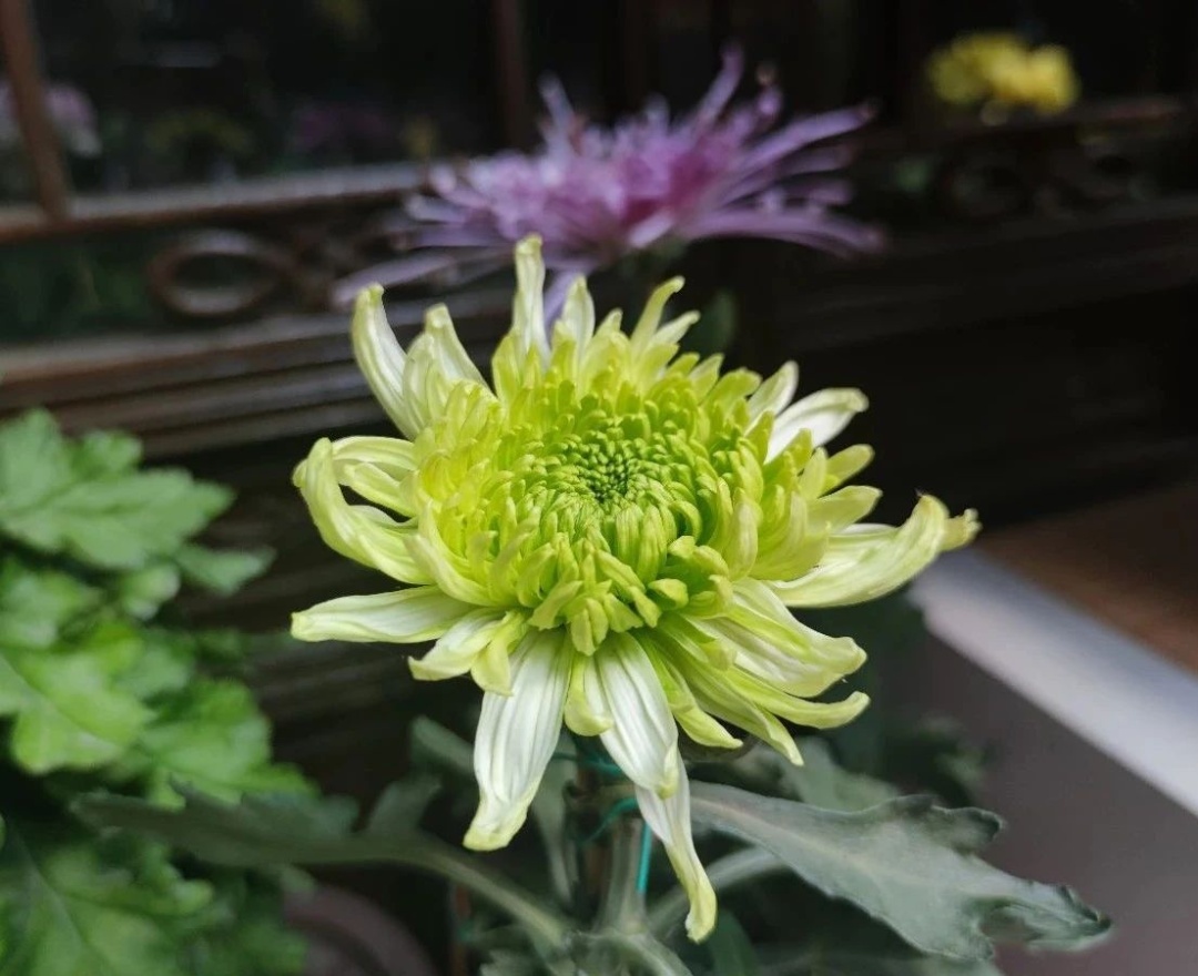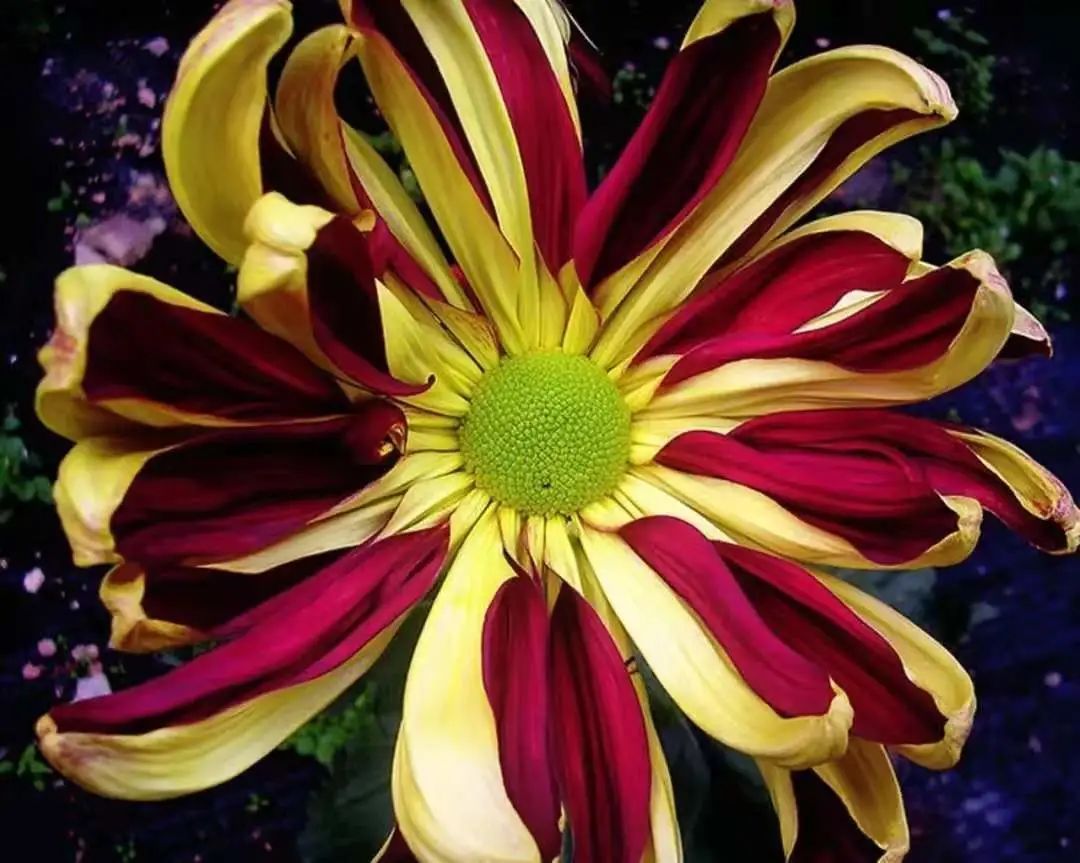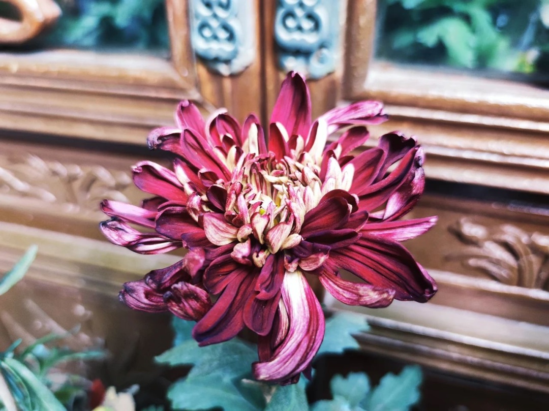 ‘帅旗’,位列中国十大名菊之首。属平瓣类,宽带型。花瓣正面紫红色,背面金黄色,中心球状花绿黄色,舌状花宽平瓣1—2轮,平展直伸或带状下垂,盘状花正常外露。