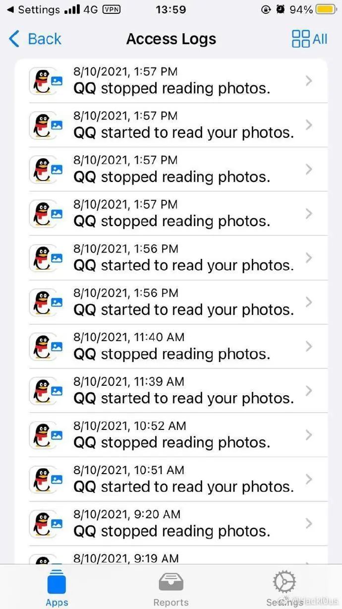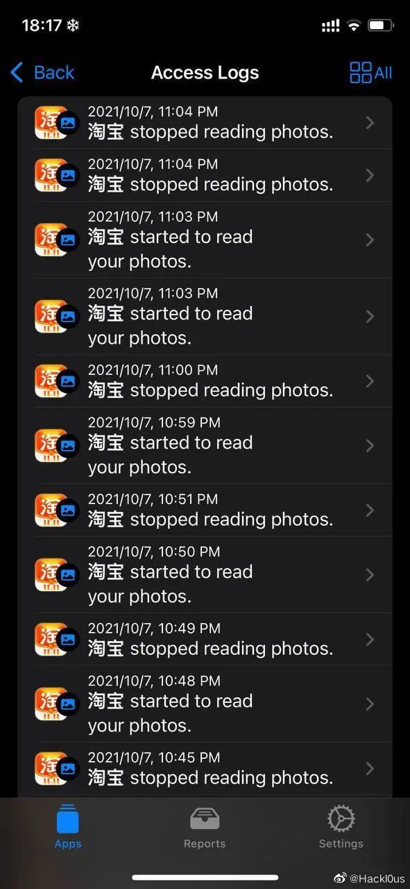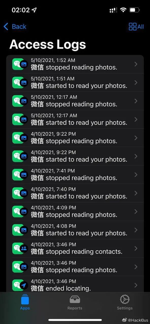 @Hackl0us 表示,自己的一个朋友开启了iOS 15的隐私新特性“记录App 活动”,对所有App的隐私读取行为进行7天的监控,并使用 App Privacy Insights 对记录进行读取。发现微信在用户未主动激活App的情况下,在后台数次读取用户相册,每次读取时间长达40秒至1分钟不等。