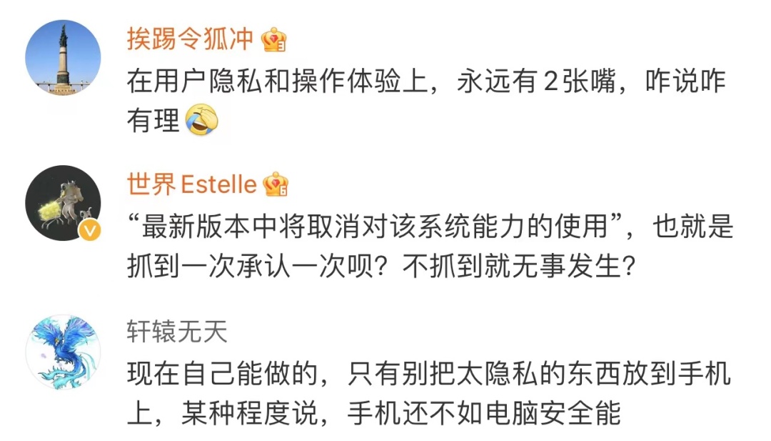 还有网友评论,“在用户隐私和操作体验上,永远有两张嘴,咋说咋有理”“只能自己别把太隐私的东西放到手机上”。