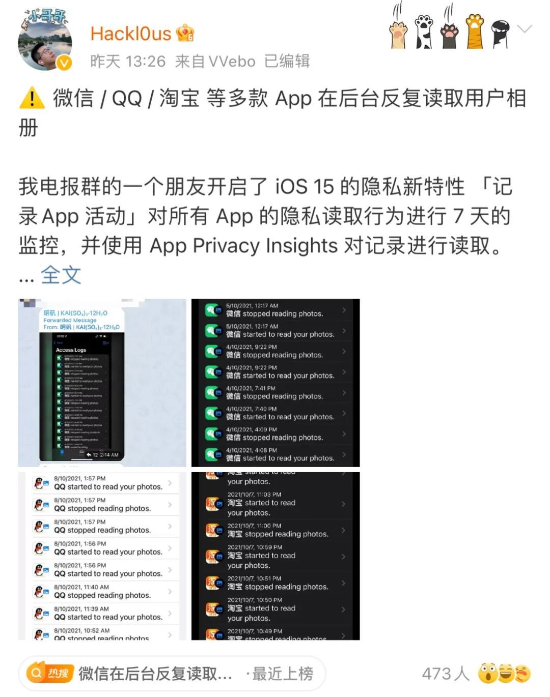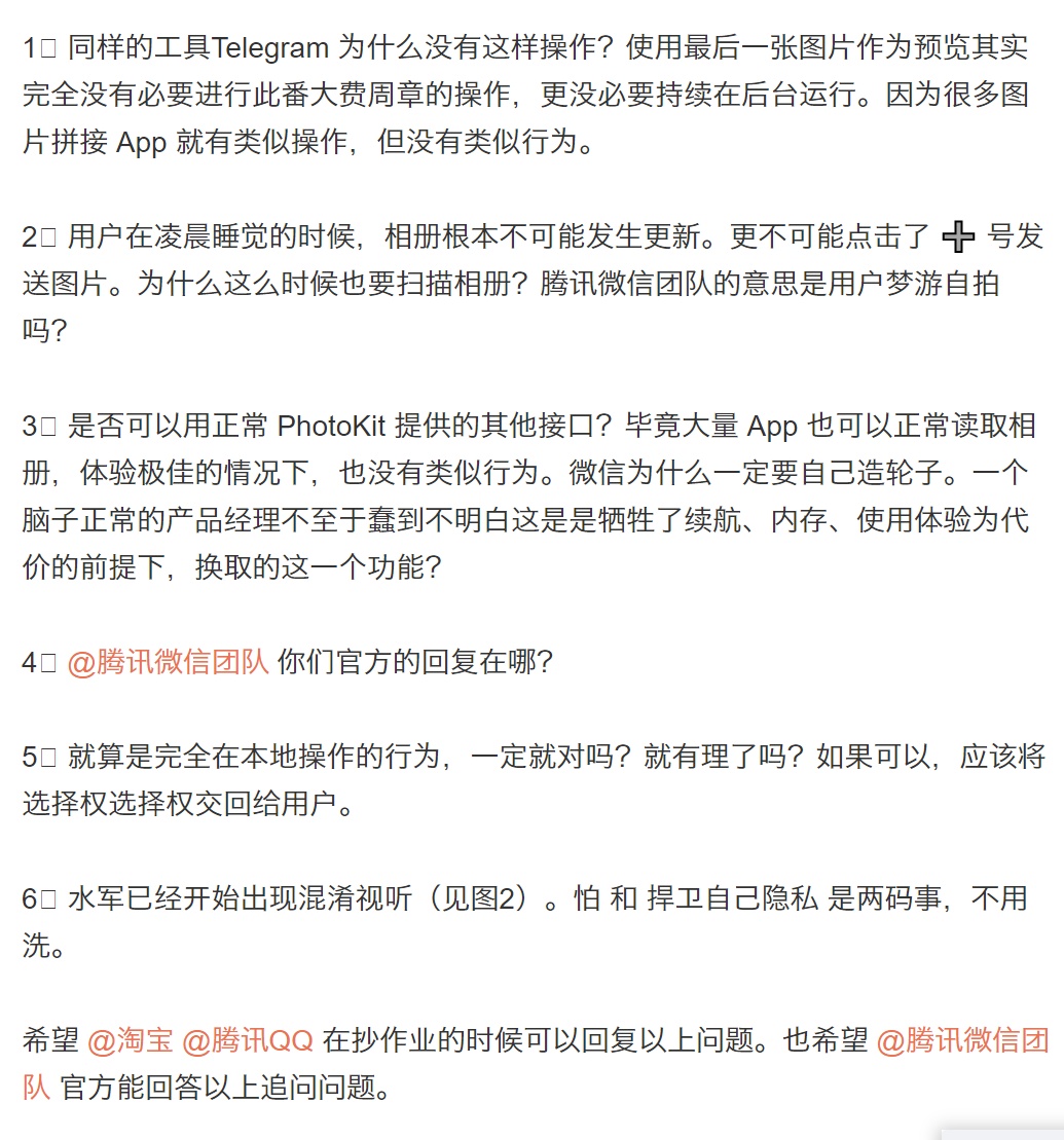 对于微信的回应,@Hackl0us 并不买账。10月8日晚,他又发布微博追加质疑,指责微信回复避重就轻:“(与微信同样性质的App)Telegram 为什么没有这样操作?为什么在凌晨用户睡觉的时候也要扫描相册?是否可以用正常 PhotoKit 提供的其他接口?@腾讯微信团队 你们官方的回复在哪?”
