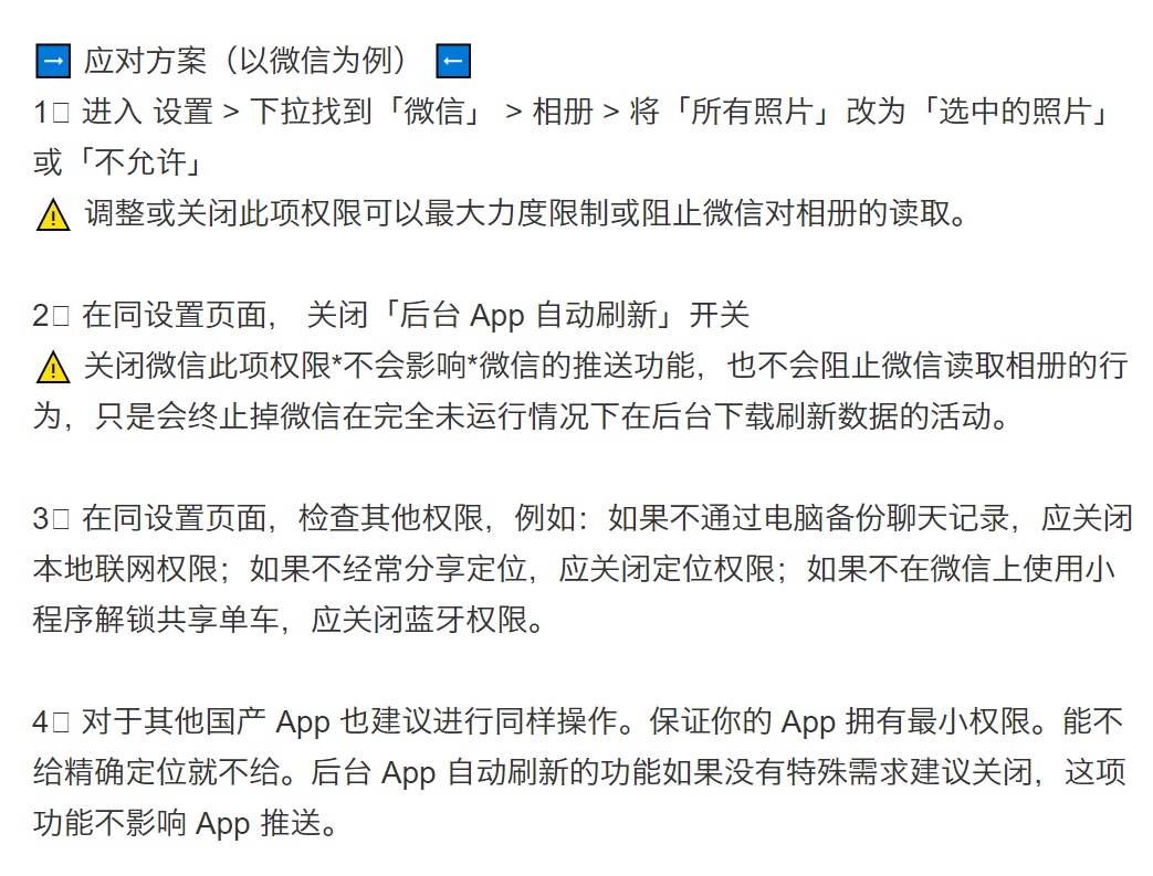 1. 进入 设置 > 下拉找到「微信」 > 相册 > 将「所有照片」改为「选中的照片」或「不允许」(需要注意的是,这项修改会在每次发图片时都要跳转,会很麻烦)