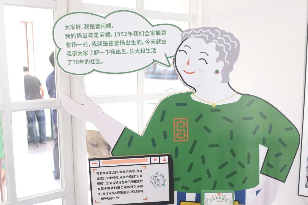 在展览中,卡通人物“曹阿姨”将以线上导览员的身份,与真人版“曹阿姨”“曹叔叔”“曹同学”一起指引和陪伴参观者,为大家讲述曹杨人的故事。