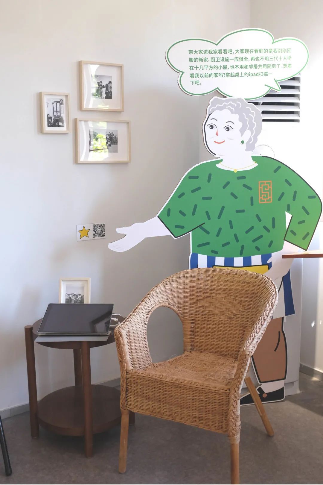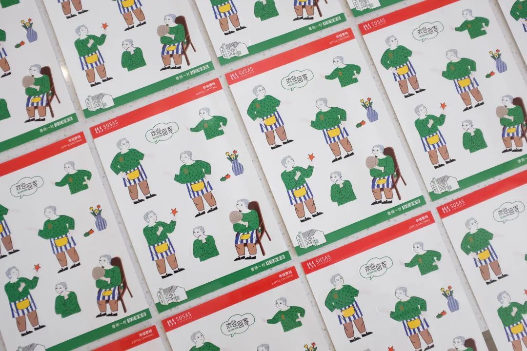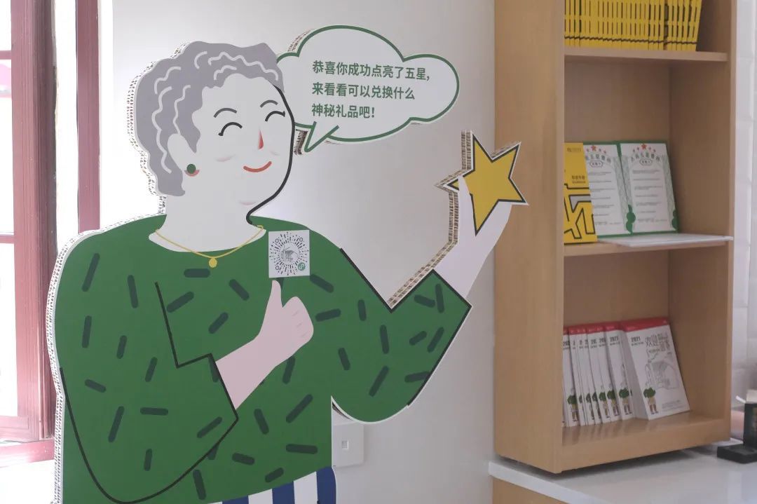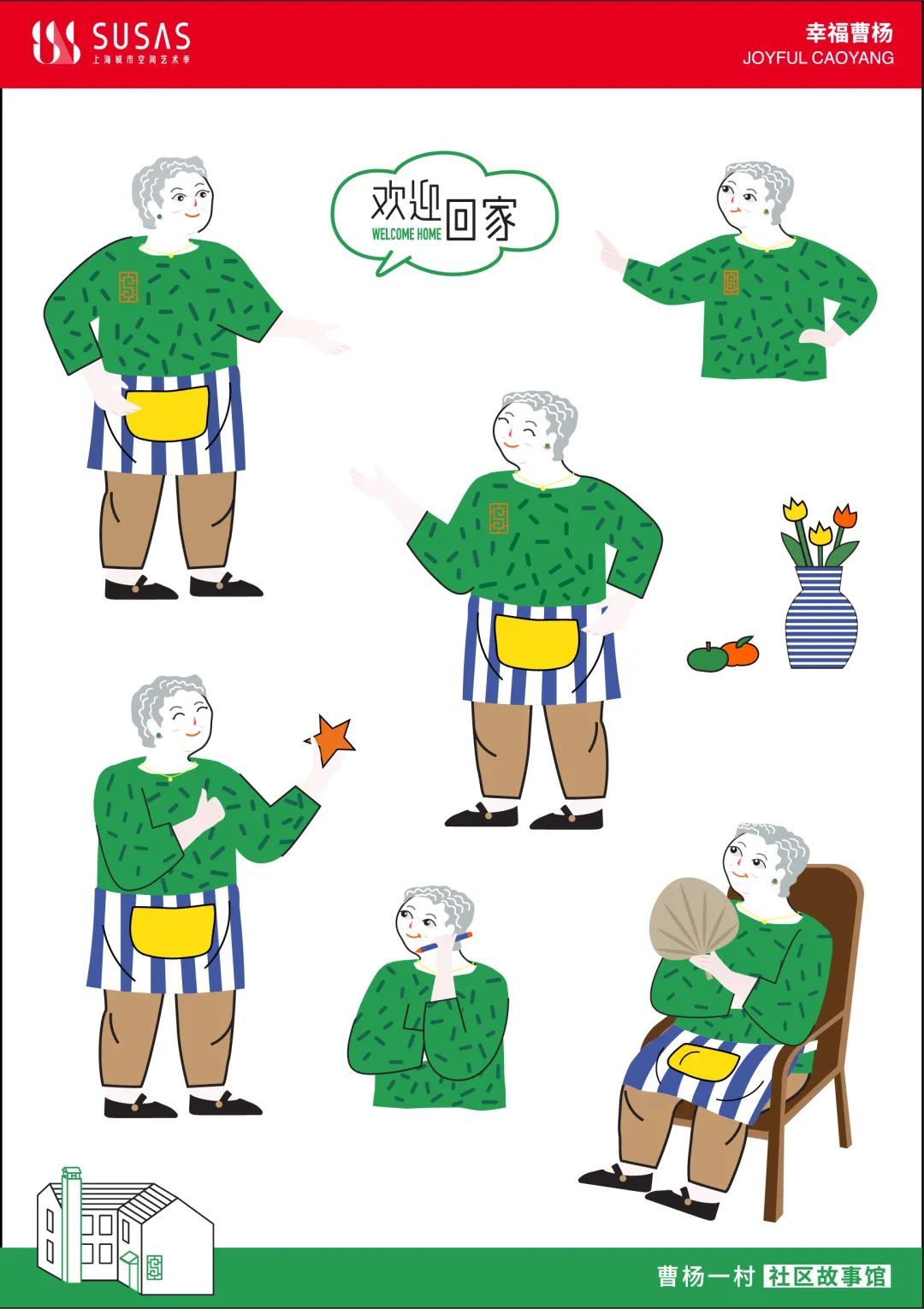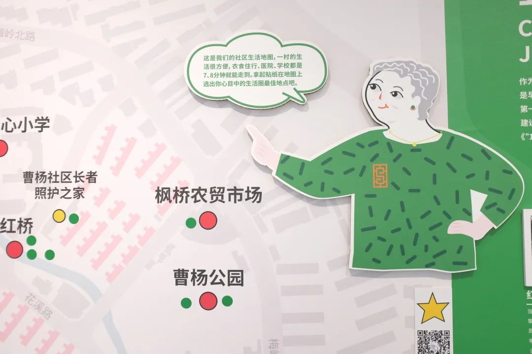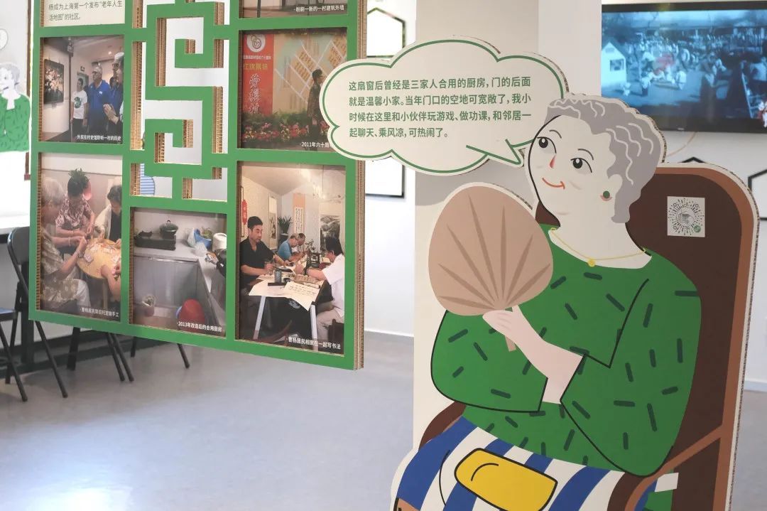 原来,在策展过程中,策展方得知有一位与曹杨新村“同龄”的新村居民,从出生的第一天起就住在曹杨新村,至今已有70年,便突发奇想地将其设计成一个卡通形象——“曹阿姨”,并通过她生活中的不同场景来展现新村的日常。