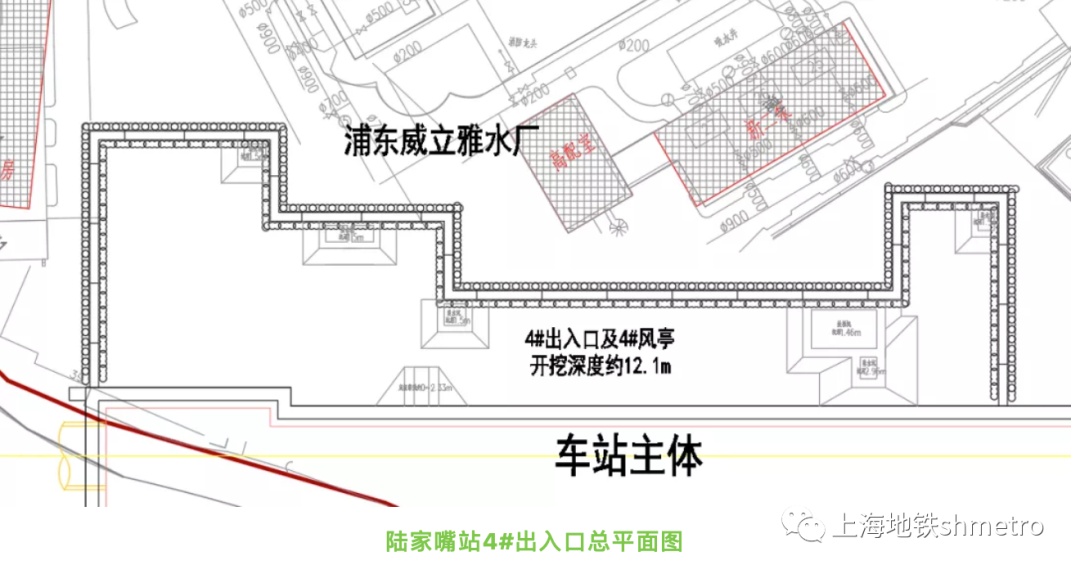 14号线陆家嘴站在2020年完成主体结构施工及道路翻交后,于今年全面进入车站附属施工。其中附属4号出入口周边环境复杂,挑战之一就是4号口北侧的上海浦东威立雅自来水厂,该水厂建成于1937年,水厂内建构筑物多为砖混结构,基础形式简单,但承担小陆家嘴地区的供水任务,每日出水能力约6~7万吨。附属基坑开挖时既要保证基坑安全又要保证北侧水厂不得出现任何问题,否则将对周边大厦造成重大影响。为此在施工期间采取了多种保护措施,重重防护,务必做到万无一失。
