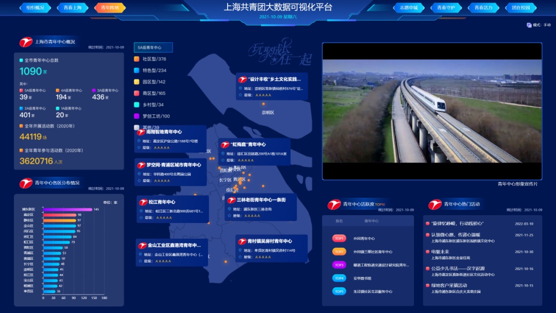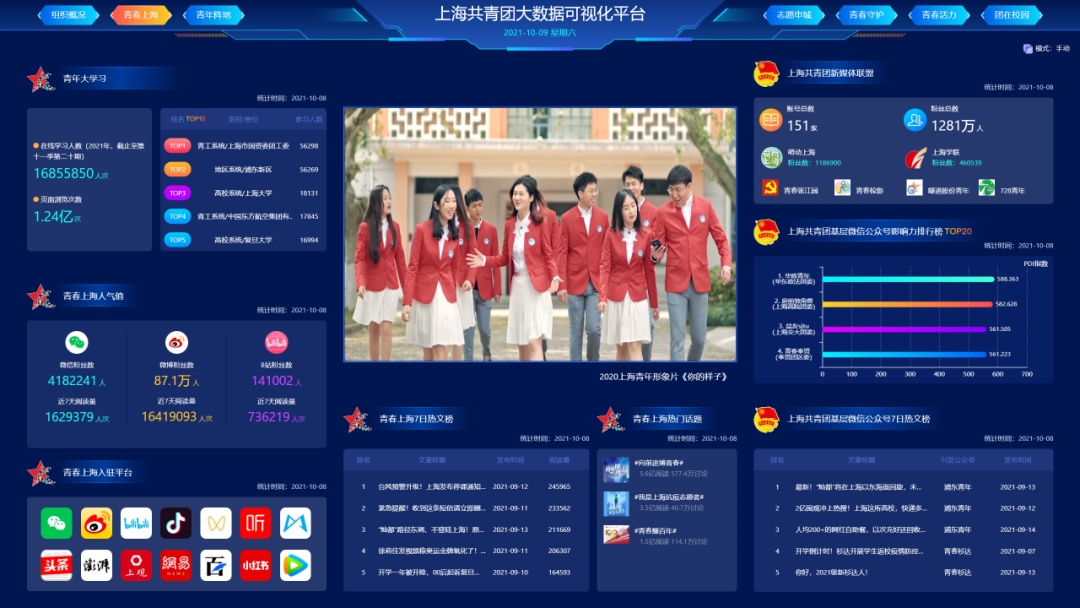 上海共青团大数据可视化平台充分利用网上共青团建设成果和大数据、云计算等先进技术,围绕组织概况、新媒体传播、青年阵地、青年志愿者、权益保护、学校共青团、重点活动7个维度,提炼出上海团员构成、青年中心分布、青年志愿者服务时长、12355咨询排行、“青年大学习”开展情况、阶段重点工作进展等一级指标49个,探索构建起城市共青团基础情况指标体系。通过数据的自动抓取、智能分析,基本实现了对上海共青团的宏观画像。