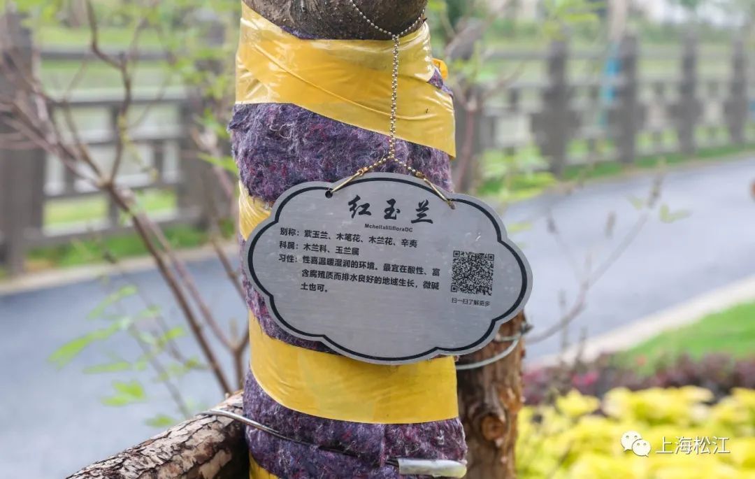 此外,公园里的树木还统一挂上了“身份牌”——植物铭牌。上面不仅标注了植物的中文名、拉丁名、科属等信息,还有一个二维码。只要对着二维码扫一扫,关于这棵树的文字介绍、图片等信息便一目了然。