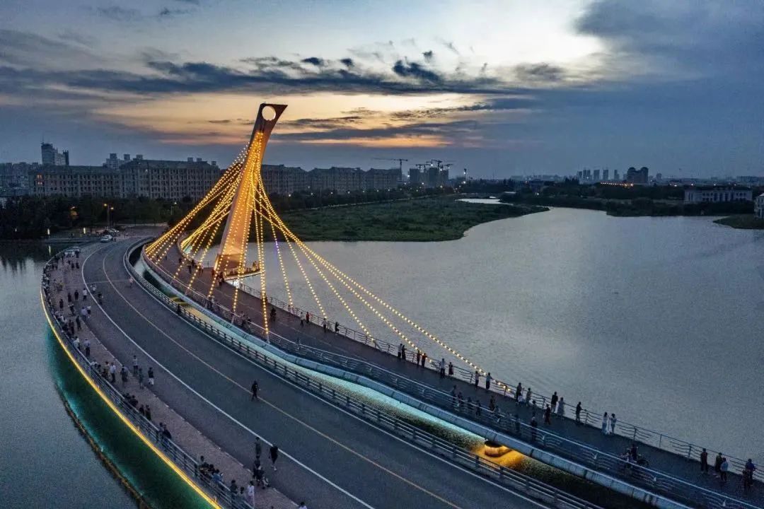 白牛塘斜拉索桥是金山枫泾的一座地标建筑。该桥全长220米,于2005年正式完工,对于便捷周边居民的出行起到了重要作用。近日,白牛塘桥完成了灯光调试,正式投入使用。夜色中,白牛塘桥流光溢彩,从远处眺望,仿若水中火凤凰,美轮美奂。
