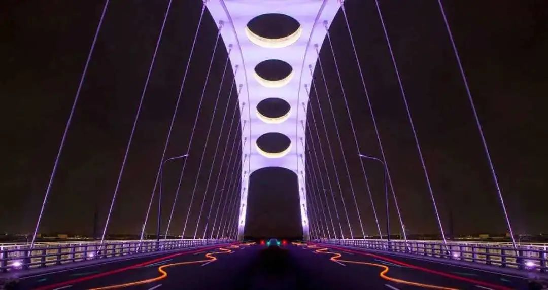 大桥为系杆拱桥结构,全桥长715米,设计时速60公里每小时。桥身安装了彩色可控光源,每到夜晚,七色炫光映衬伟岸桥体。