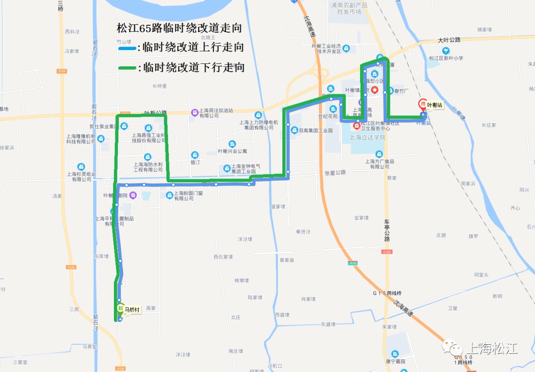 临时绕改道走向:(上行)走向不变,按原线路行驶。(下行)自叶榭站起经车亭公路、叶新公路、求仁路、叶权路、叶校路、叶政路、叶旺路、辕门路、亭浦路、叶新公路、张泽路竹亭路至马桥村。