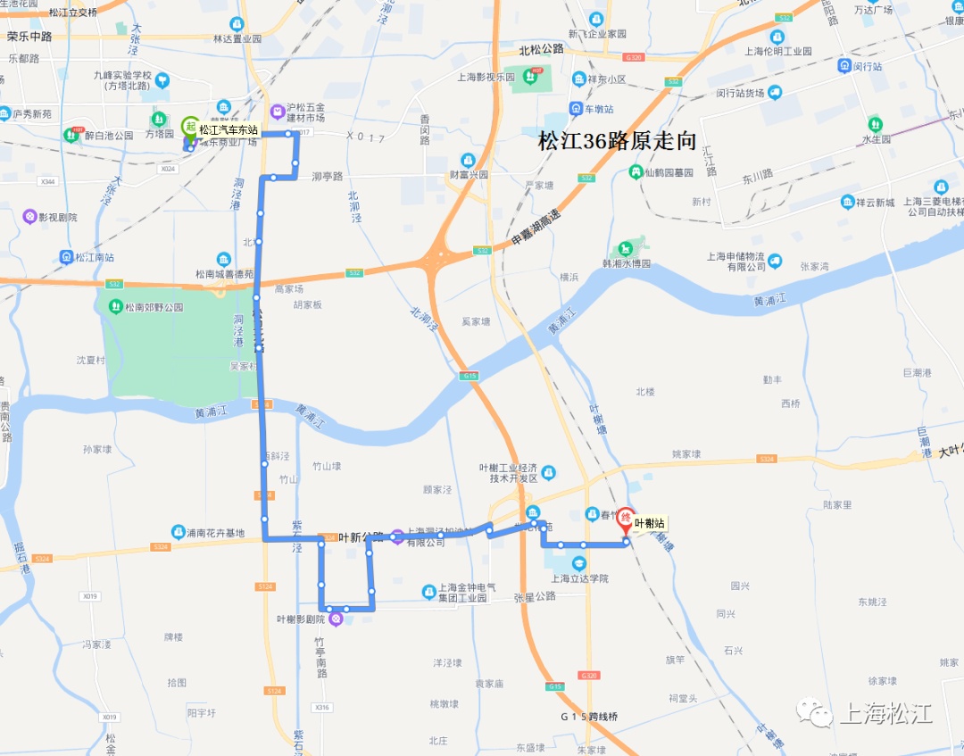 现走向:自松江汽车东站起经北松公路、荣福路、泖亭路、松卫北路、叶新公路、张泽路、辕门路、浦亭公路、叶新公路、叶旺路、叶政路、叶校路、叶权路至叶榭站。