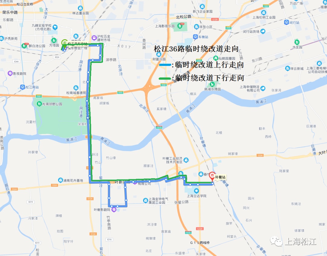 临时绕改道走向:(上行)走向不变,按原线路行驶。(下行)自叶榭站起经叶权路、叶校路、叶政路、叶旺路、叶新公路、松卫北路、泖亭路、荣福路、北松公路至松江汽车东站。