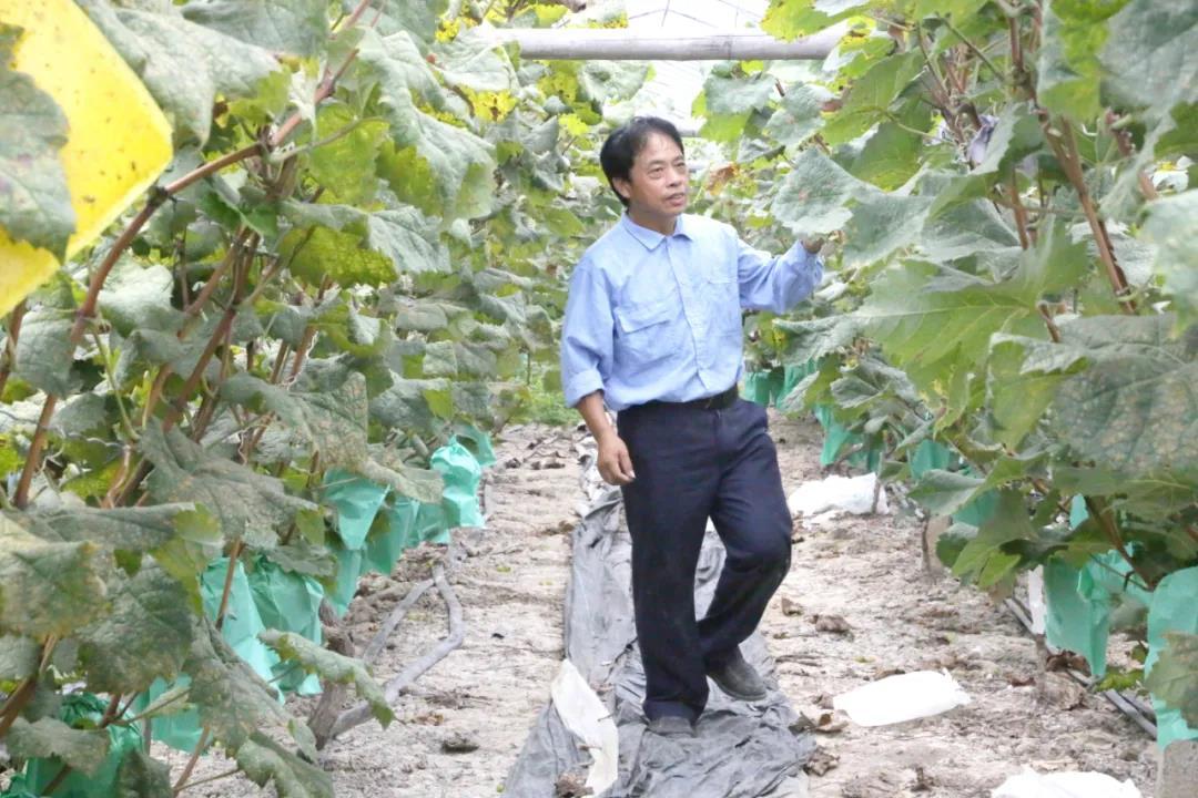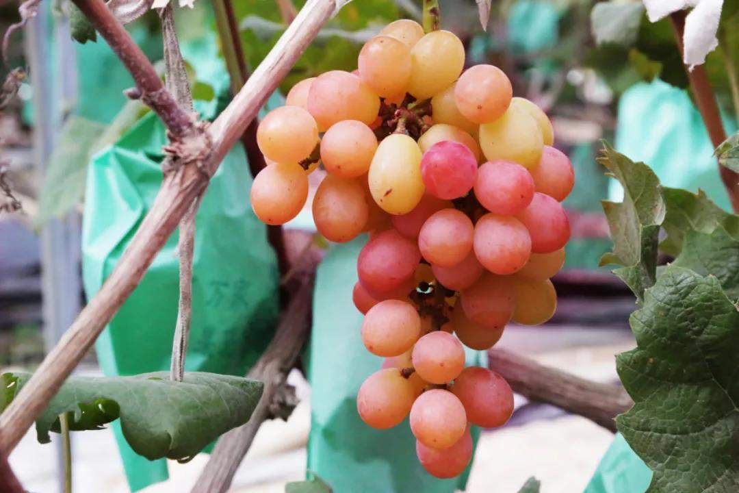“这个品种在市面上并不多见,我们当初引种也是花了不少心思。”黄汉昌介绍,合作社在2019年开始引进试种,但由于高温和强光照的因素,基地内许多“妮娜皇后”出现了不同程度的表皮坏死症状。几经摸索尝试,黄汉昌选择将葡萄架调整为“V”字型,这使得果穗受到枝叶遮阳,也有效保障了通风透光。同时通过使用透气良好的套袋,加上精心呵护,终于在今年实现了丰收。