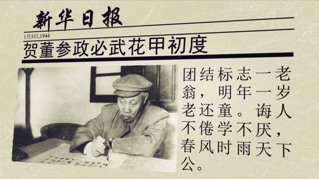 在1944年1月5日的《新华日报》上就刊登陶行知《贺董参政必武花甲初度》:团结标志一老翁,明年一岁老还童。诲人不倦学不厌,春风时雨天下公。