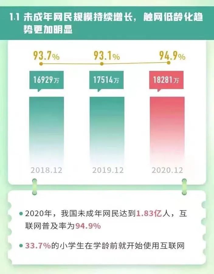 据共青团中央、中国互联网络信息中心(CNNIC)等联合发布的《2020年全国未成年人互联网使用情况研究报告》显示:2020年,我国未成年网民达到1.83亿人,互联网普及率为94.9%;超过三分之一的小学生在学龄前就开始使用互联网,孩子们首次触网的年龄越来越小。