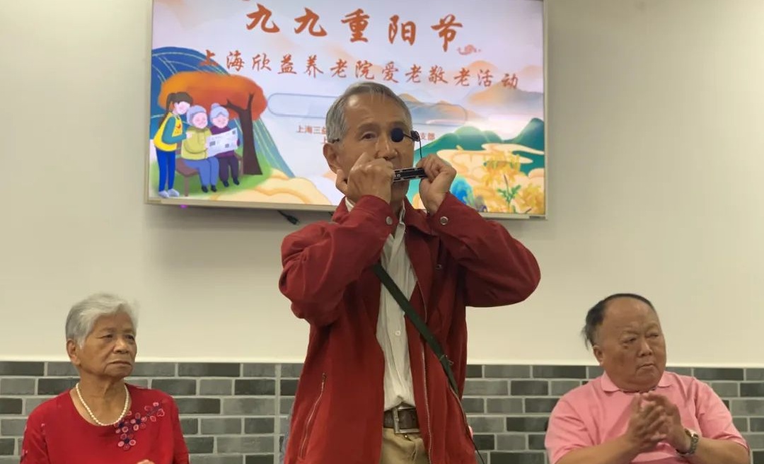 李杭生就是今天到场观看表演的住养老人之一。听到兴起处,他也忍不住拿出了自己的口琴,上台吹奏了一段美妙乐曲,引得台下不少老人陶醉其中,还随着音乐鼓起了掌。