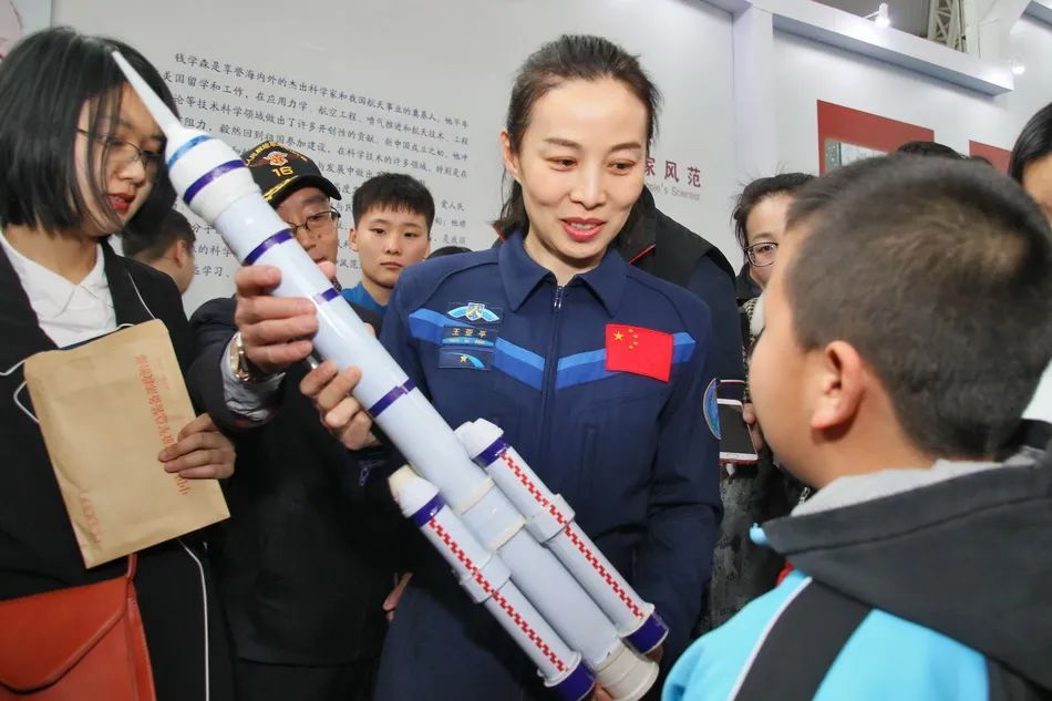2019年3月26日,山东烟台,中学生们将自己亲手制作的礼物赠送给航天员王亚平。
