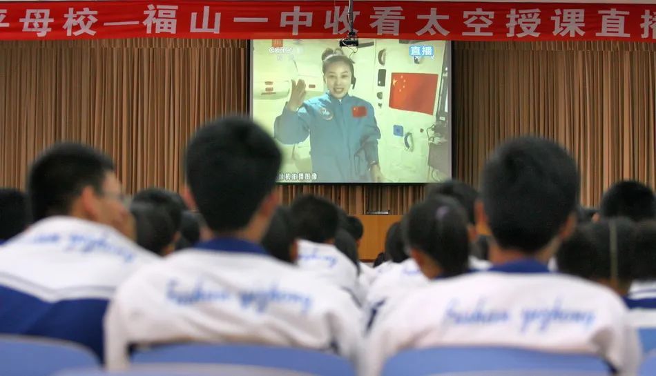 2013年6月20日,山东烟台,中国女航天员王亚平在神舟十号宇宙飞船上成功进行中国首次太空授课,王亚平母校福山一中全体师生共同收看了授课的全过程。