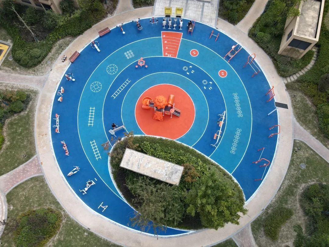 健身苑点的地面铺设了塑胶,圆形的场地被分为了多个训练区域,有青少儿游乐设施区域、老年人锻炼区域以及青年人力量锻炼区等。