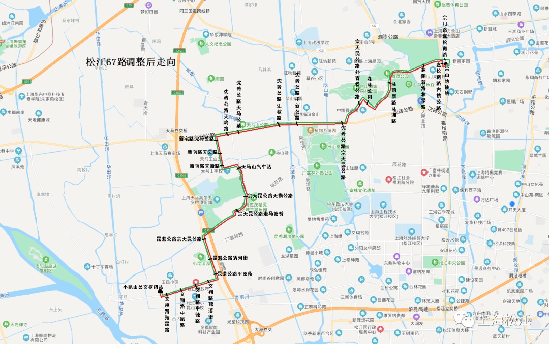 调整后走向:(上行)自佘山地铁站起经古楼公路、嘉松南路、林荫新路、外青松公路、佘天昆公路、沈砖公路、新宅路、天新路、佘天昆公路、昆港公路、文翔路至小昆山公交枢纽站。(下行)自小昆山公交枢纽站起经文翔路、昆港公路、佘天昆公路、天新路、新宅路、沈砖公路、佘天昆公路、外青松公路、林荫新路、佘月路、泗凯南路、古楼公路至佘山地铁站。