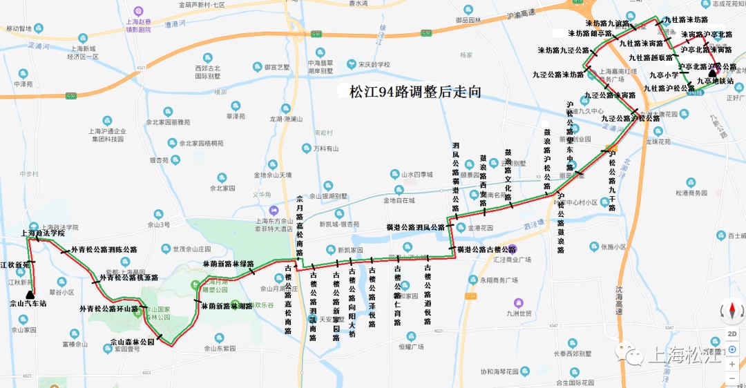 调整后走向:(上行)自佘山汽车站起经千新公路、外青松公路、林荫新路、佘月路、泗凯南路、古楼公路、横港公路、泗凤公路、鼓浪路、沪松公路、九泾公路、涞坊路、九杜路、涞寅路、沪亭北路至九里亭临时公交枢纽站。(下行)走向不变,按原线路行驶。