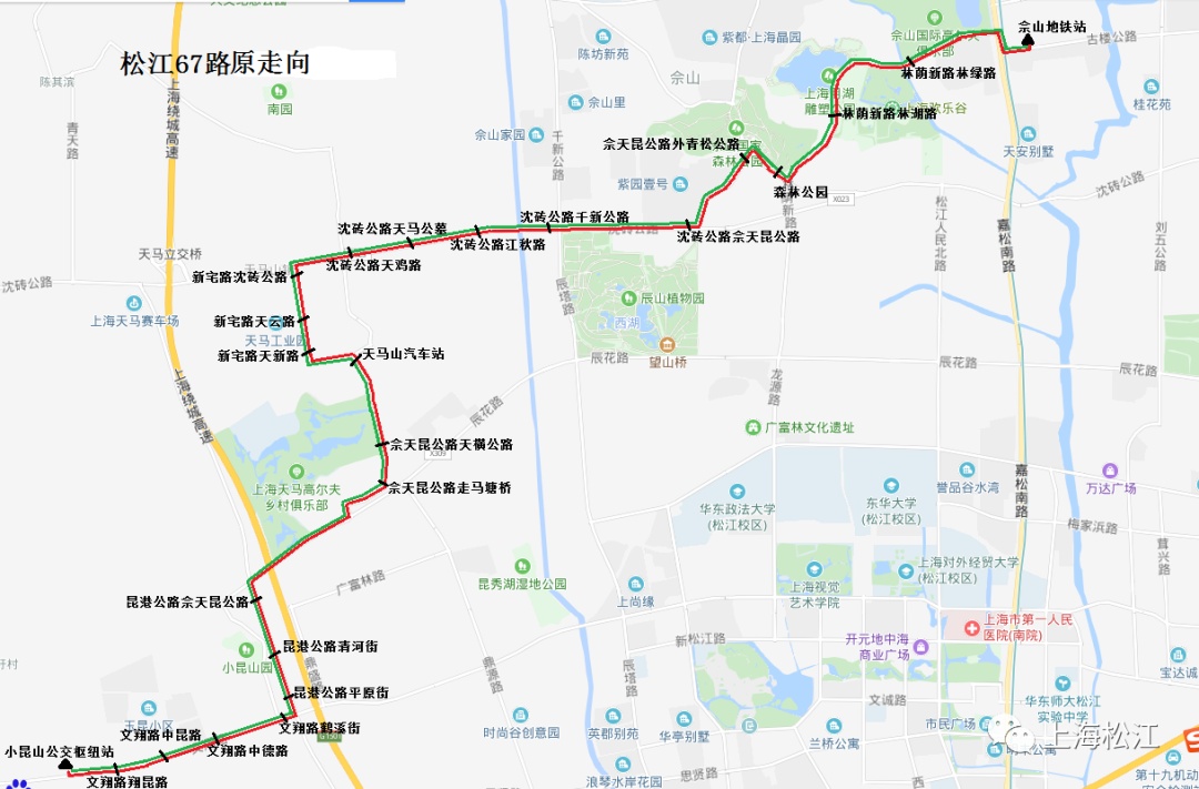 原走向:自佘山地铁站起经古楼公路、嘉松南路、林荫新路、外青松公路、佘天昆公路、沈砖公路、新宅路、天新路、佘天昆公路、昆港公路、文翔路至小昆山公交枢纽站。