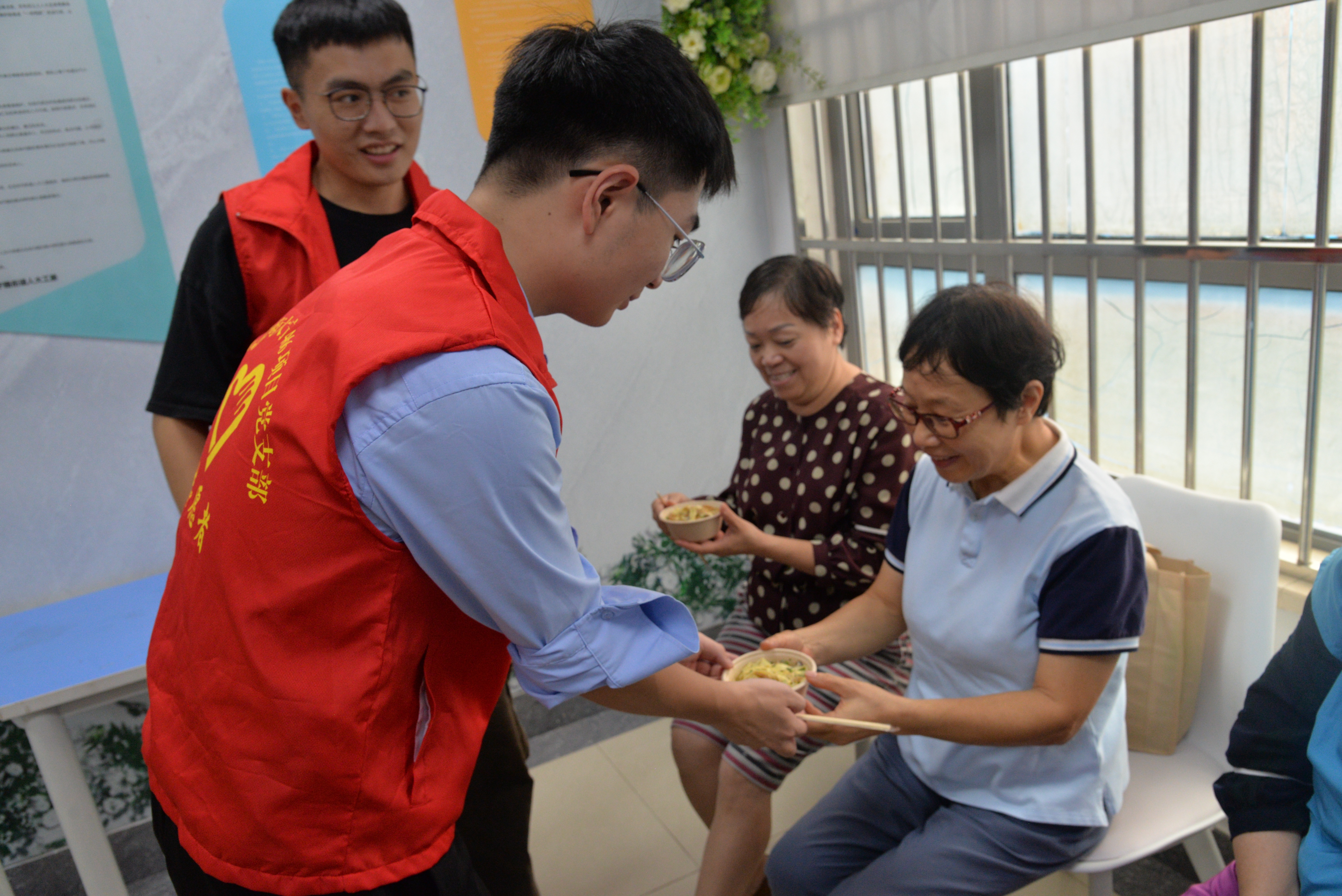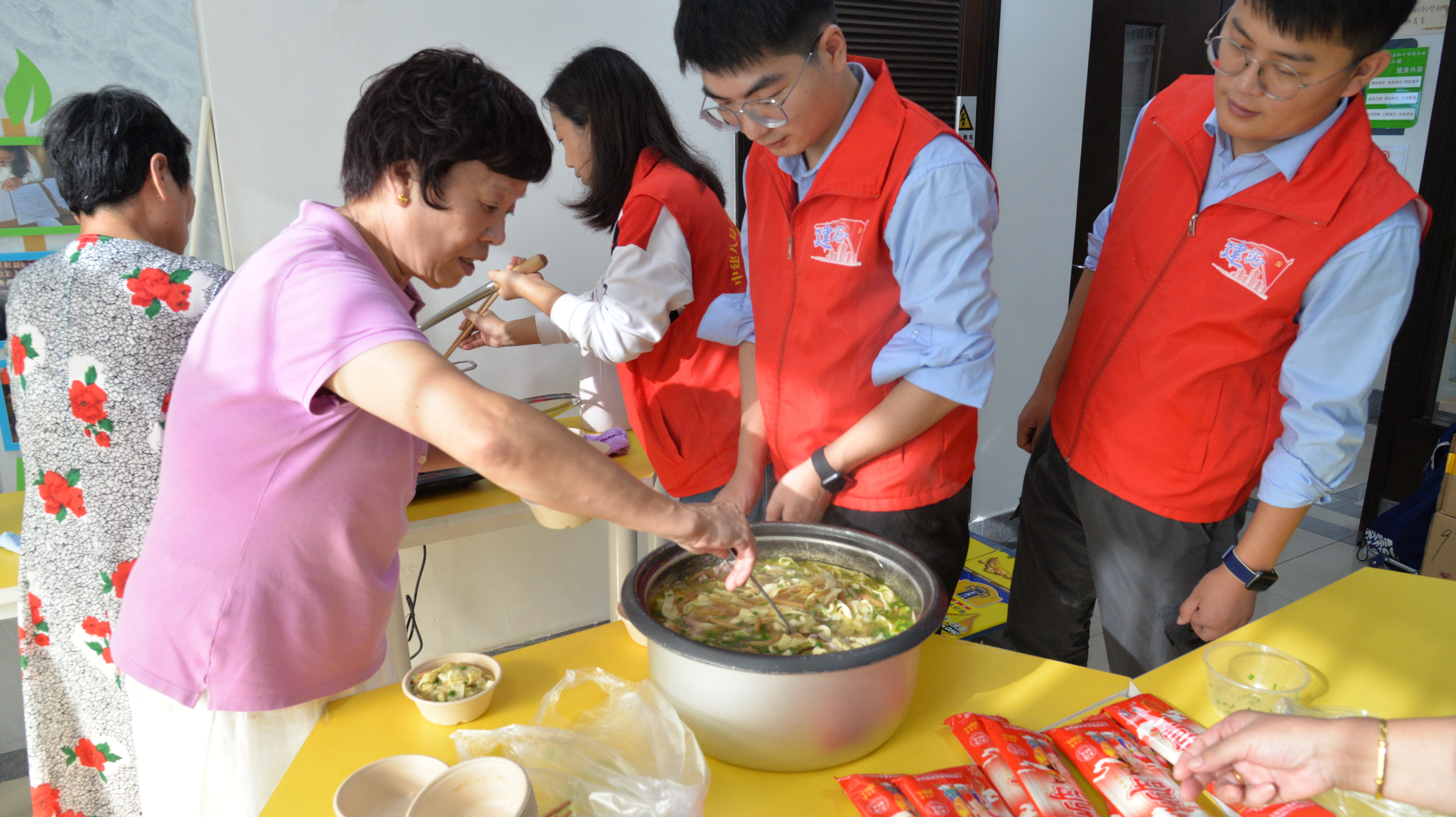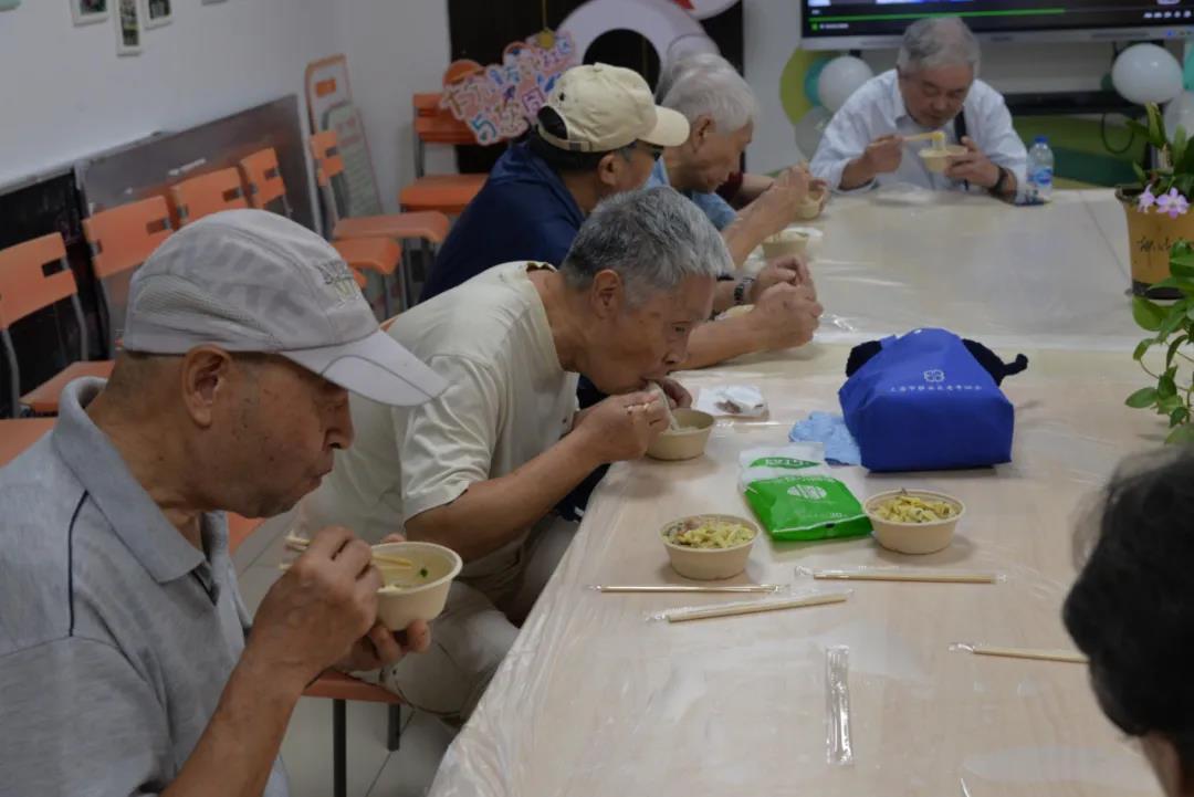 在大宁路街道慧芝湖花园居民区,党总支安排了为老人免费量血压、测血脂、理发、观影《中国医生》、防金融诈骗宣传等活动。保障房项目党支部则精心准备了适合老年人吃的面条,搭配湖北特色的蛋花肉丝香菇浇头,将一碗碗热气腾腾的盖浇面,送到了慧芝湖花园。