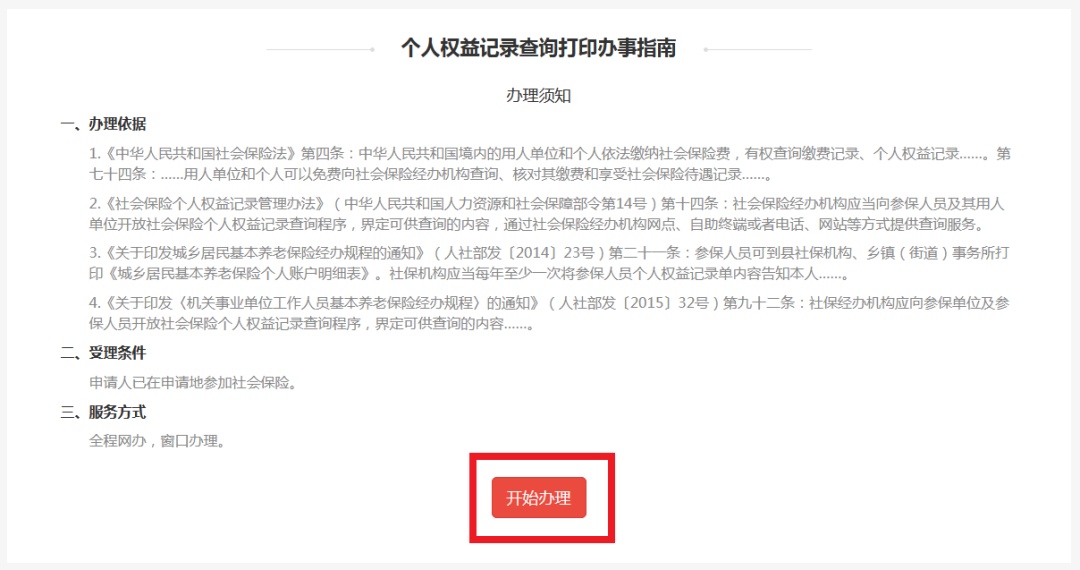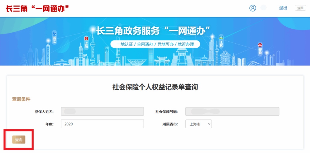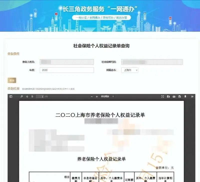 登录“一网通办”平台,选择“长三角一网通办”特色栏目,依次点击“个人服务”——“社会保障”——“个人权益记录查询打印”——“开始办理”,选择对应“年度”和“所属省市”后点击“查询”。