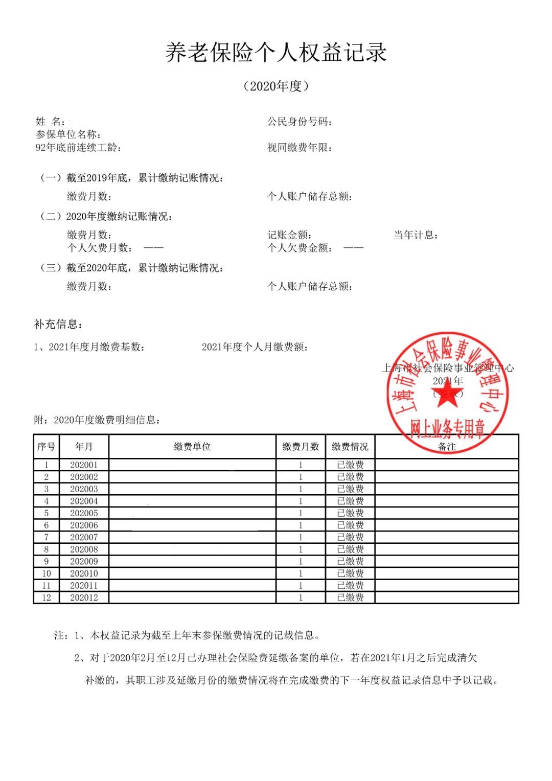 市人社局说,为进一步方便参保人员查询获取个人权益记录信息,2020年度电子《养老保险个人权益记录》已上线,市民朋友可通过“一网通办”、“上海人社”APP、“随申办”APP三种方式查询获取。详见↓
