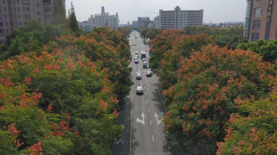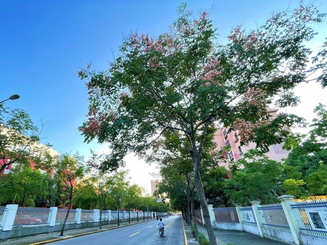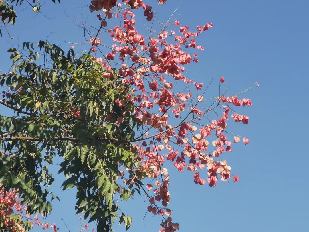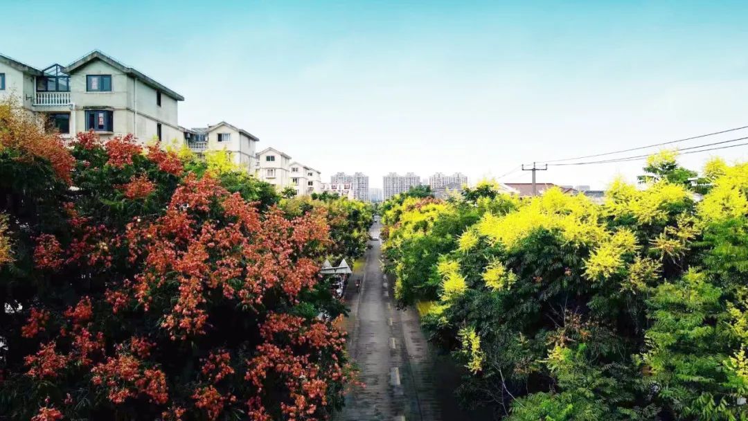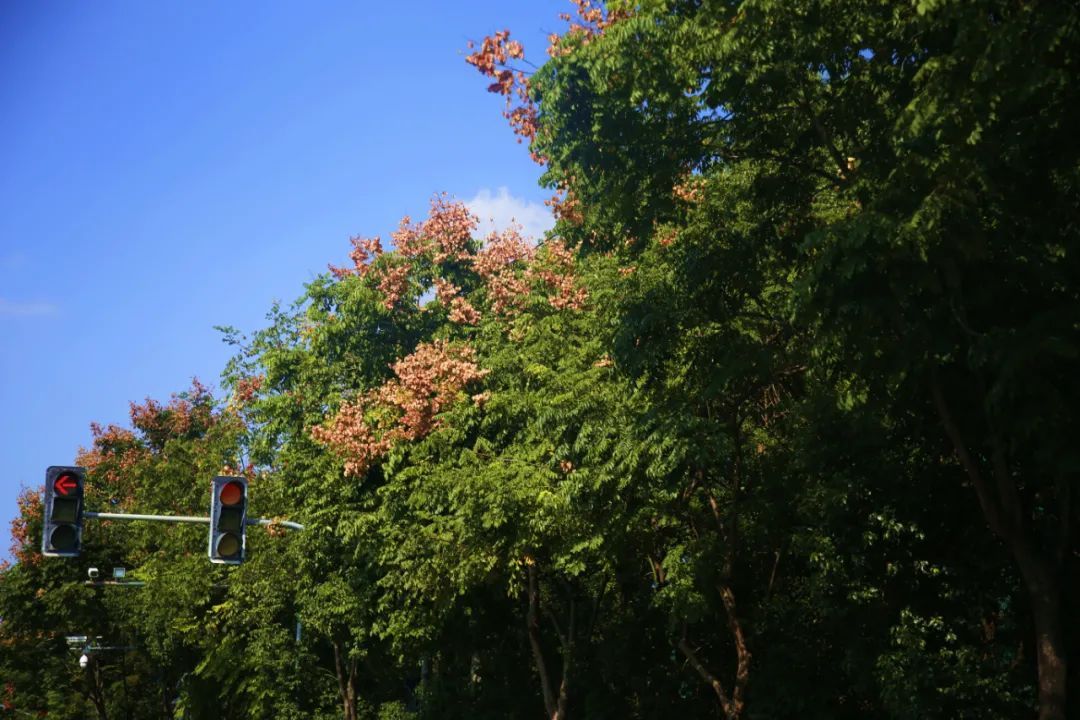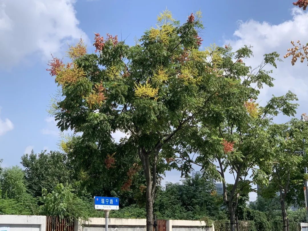 瑞宁路的栾树最先跟上了“秋天的节奏”,葱茏的绿叶之间,栾树火红的蒴果挂满枝头。微风拂过,摇曳多姿,百看不厌。