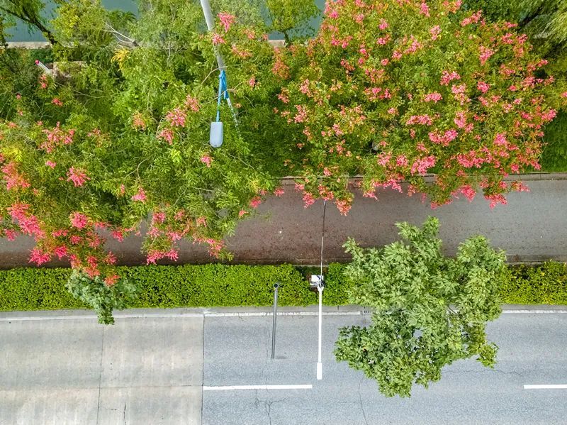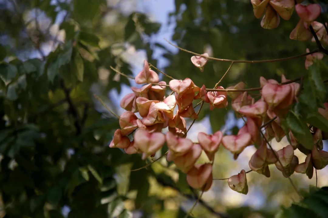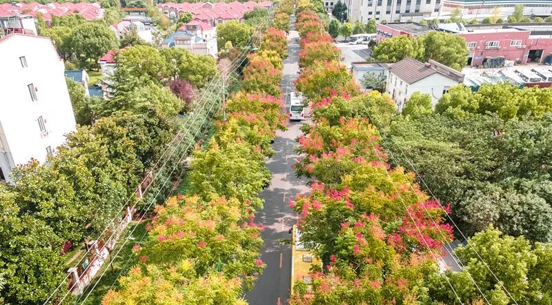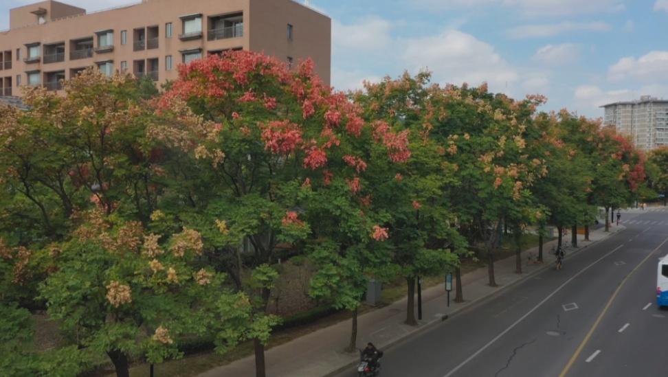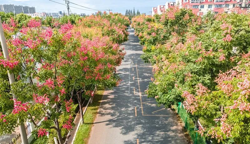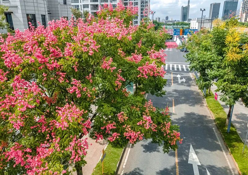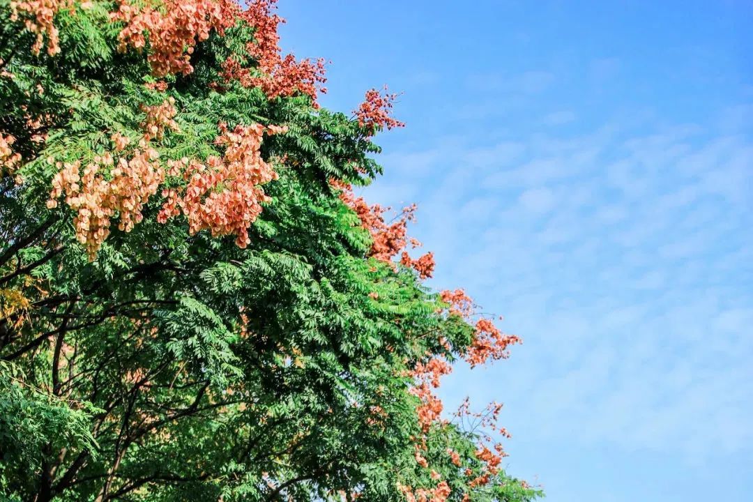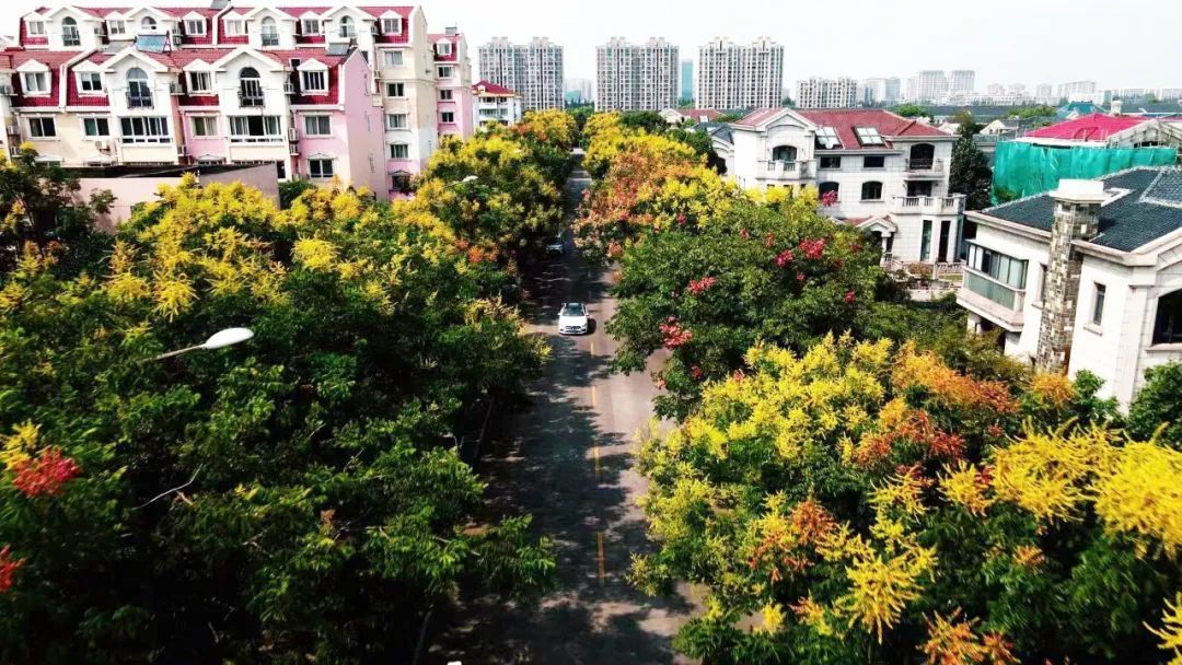 瑞宁路的栾树最先跟上了“秋天的节奏”,葱茏的绿叶之间,栾树火红的蒴果挂满枝头。微风拂过,摇曳多姿,百看不厌。