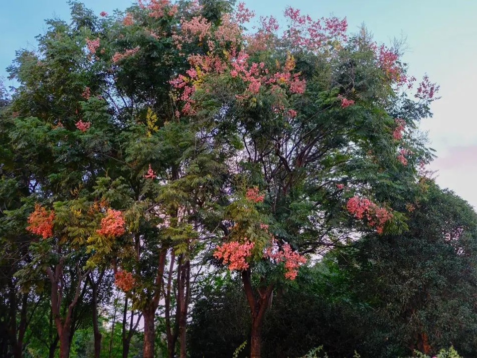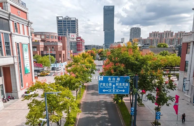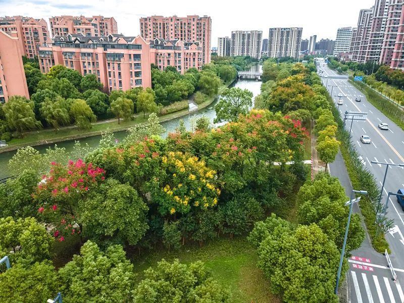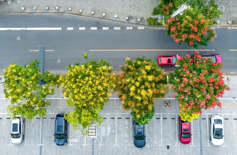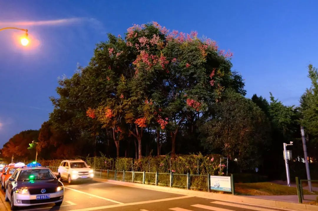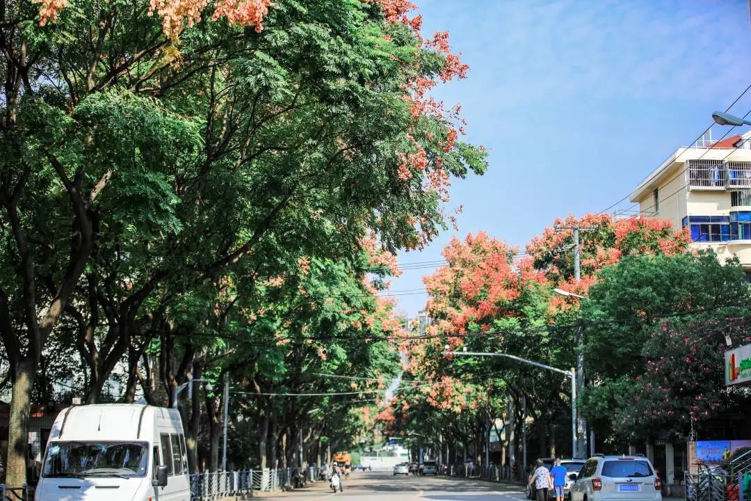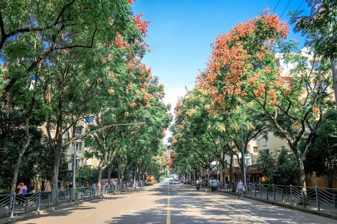 瑞宁路的栾树最先跟上了“秋天的节奏”,葱茏的绿叶之间,栾树火红的蒴果挂满枝头。微风拂过,摇曳多姿,百看不厌。