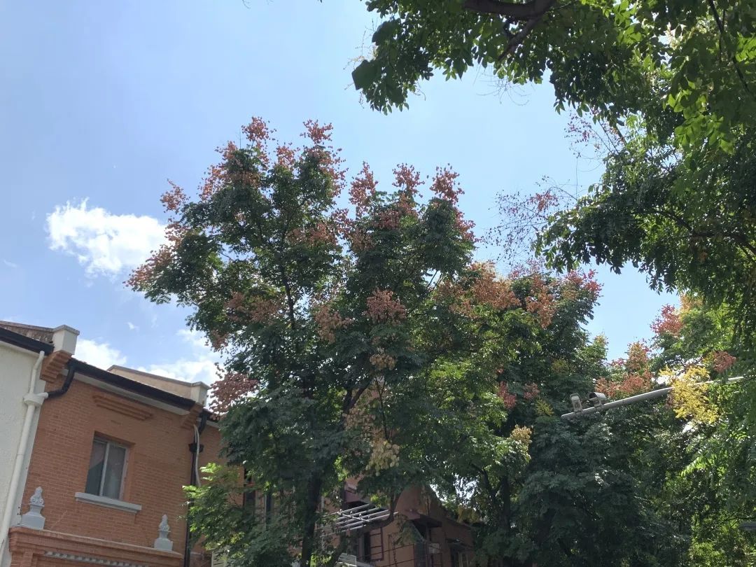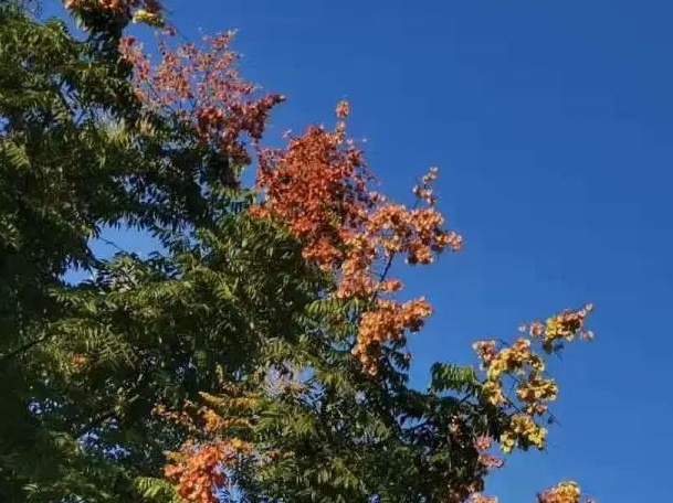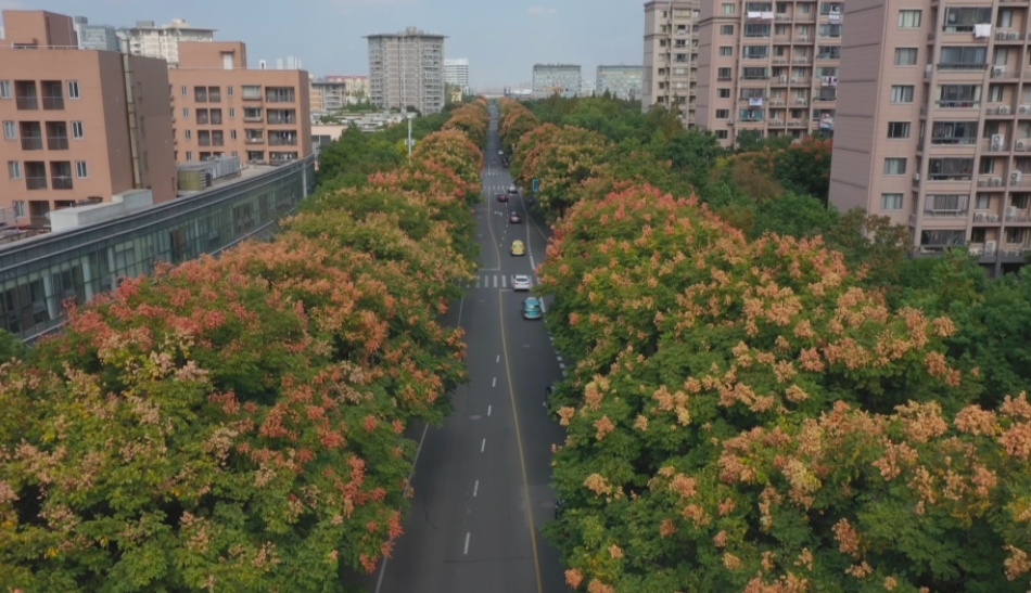 嘉善路两旁的栾树,从初生的鹅黄、青绿到逐渐成熟的浅橙、酒红,深深浅浅、层层叠叠,在阳光下熠熠生辉,渲染出秋日的风姿。