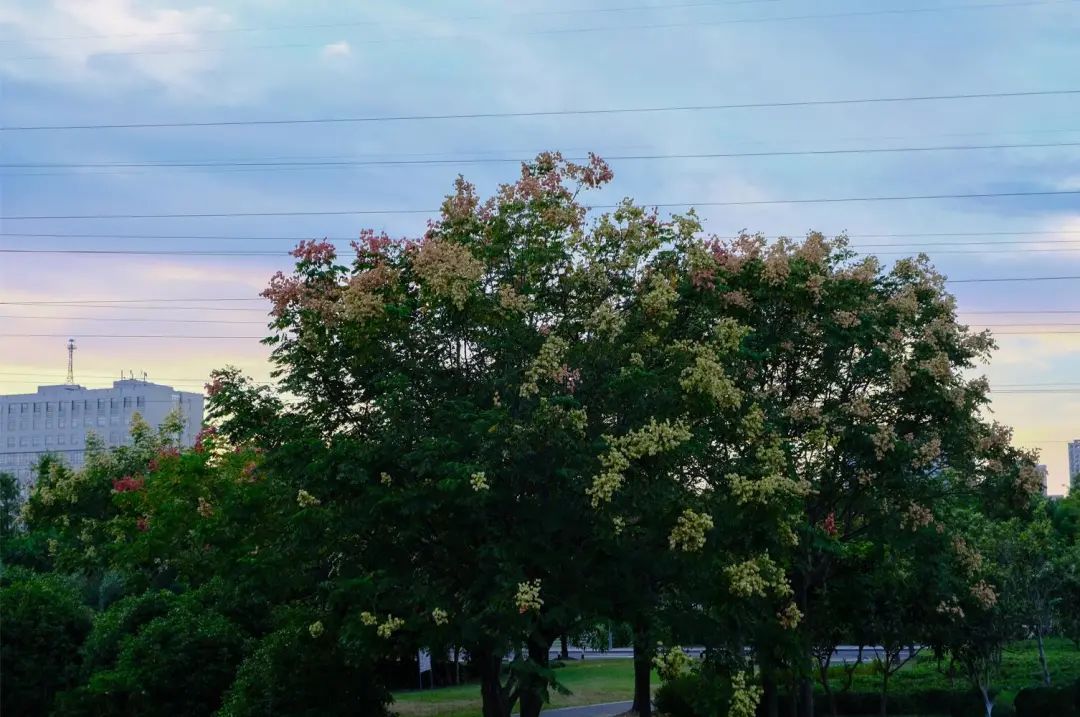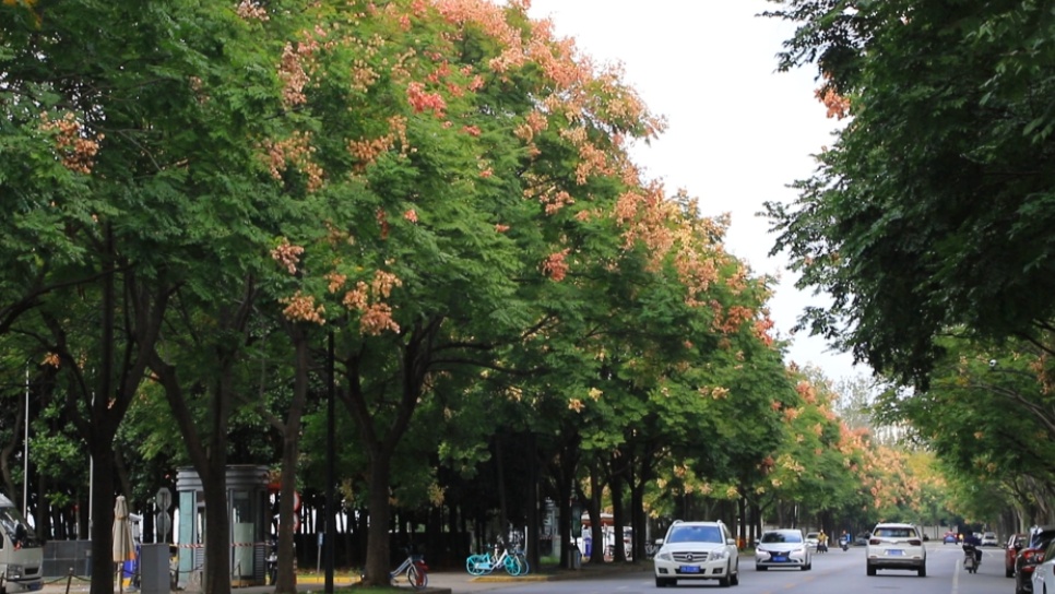 在科苑路靠近晨晖路段,道路两旁的栾树开满了黄色,有的已经结出了红色的果实。层层叠叠的花朵和果实仿佛给栾树披上了彩色的头巾。花朵和果实在微风中轻轻摇曳,飘散出淡淡的香味,将整条道路装饰得温馨迷人。