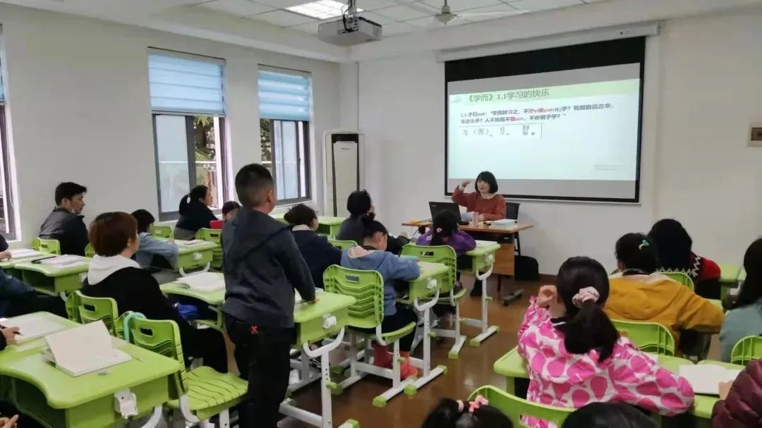 四平路街道的国学课堂还有一个特点,那就是以亲子教学为主。目前,每个班级有二十余对亲子家庭,上课形式主要有两种:一是“经典教学”,按照《论语》《孟子》《大学》《中庸》等儒家经典次序,逐章讲解,以明学不躐等、循序渐进之义。二是“亲子教学”,也是课堂形式的特色之一,通过形成“经典—讲师—家长—少儿”的“学习链”,构架书香型家庭,更好地发挥经典的教育意义。