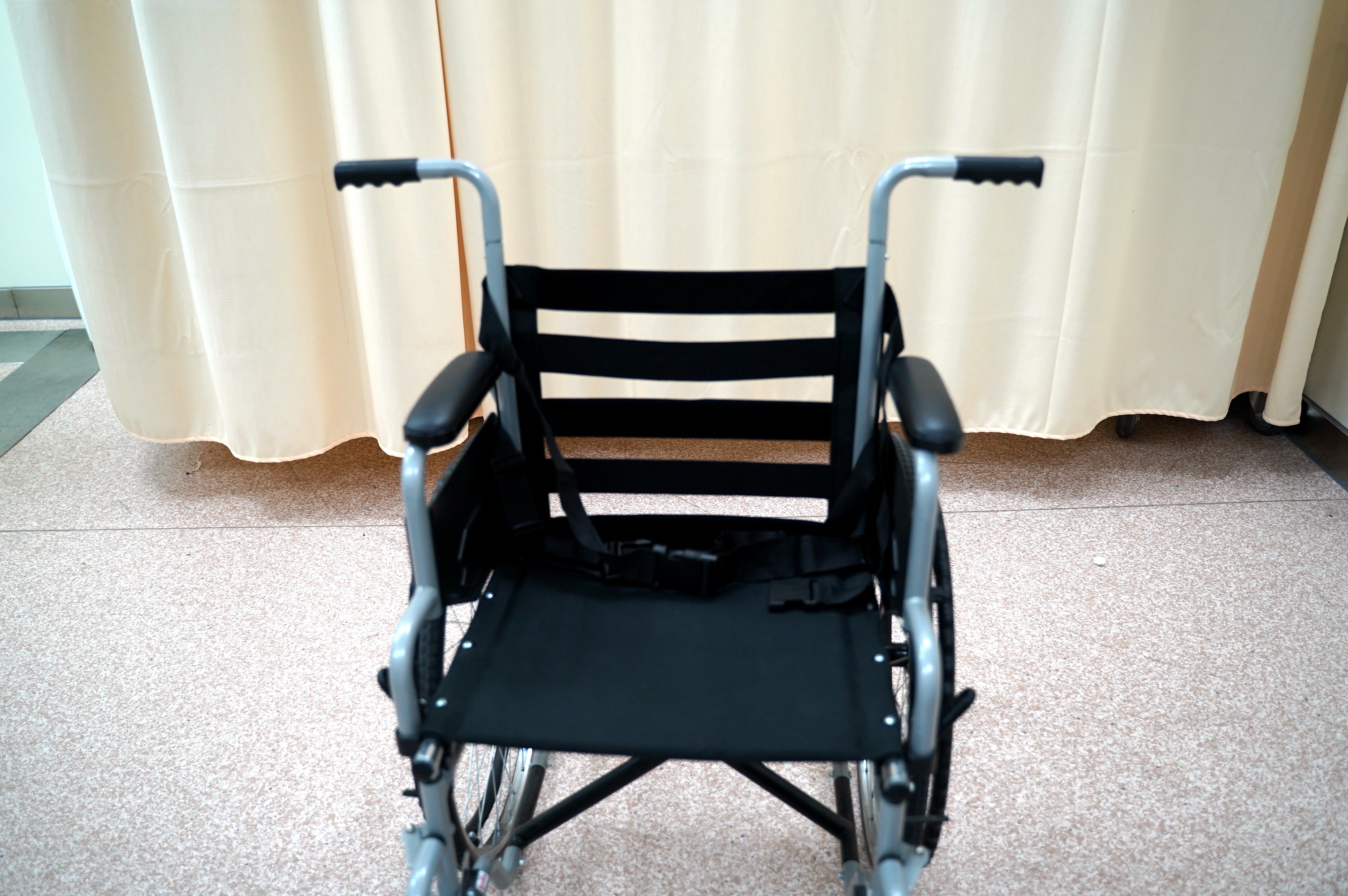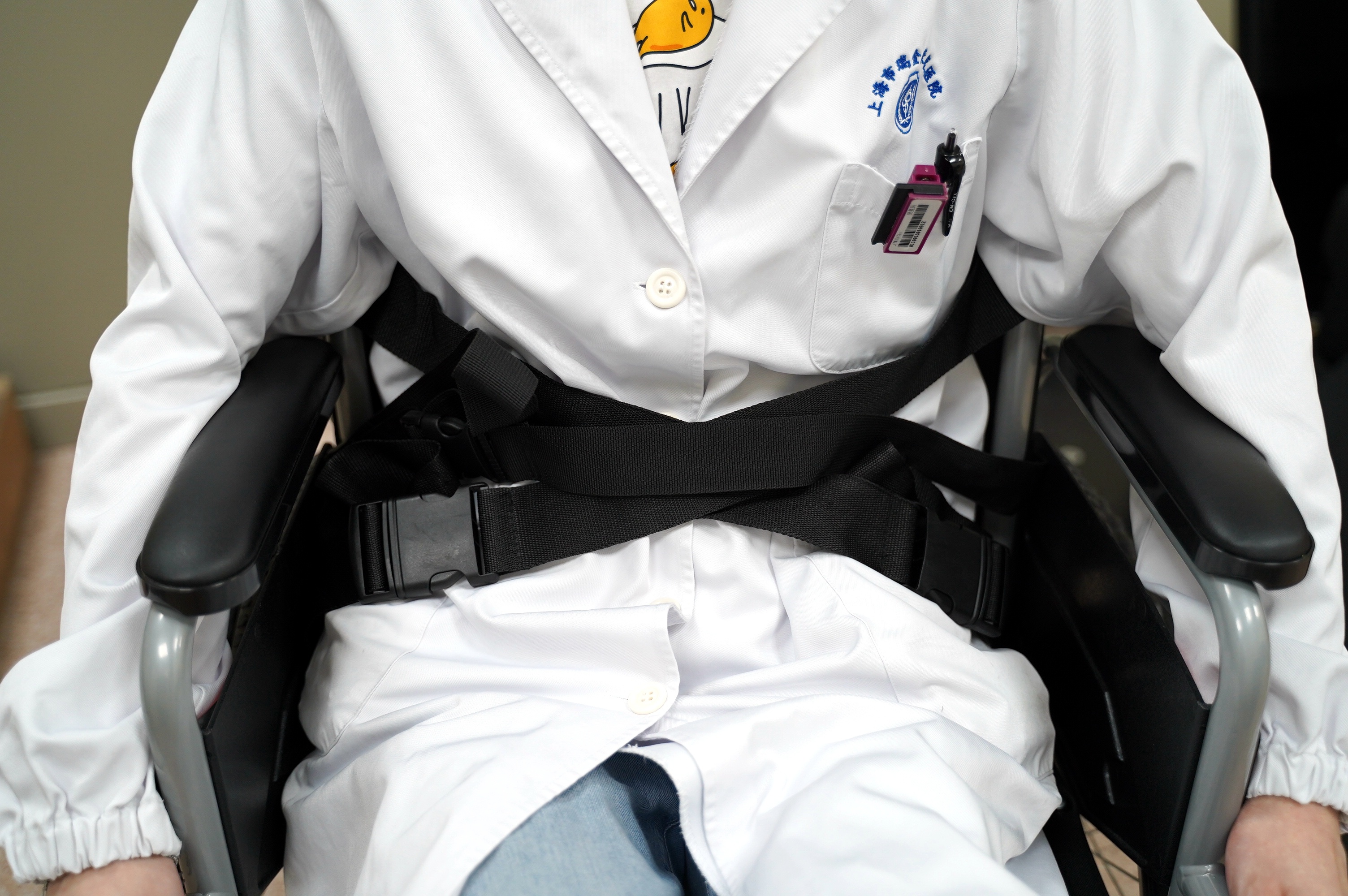 轮椅设置交叉式安全装置,牢牢固定住患者身体,避免倾斜、下滑,确保医疗安全。