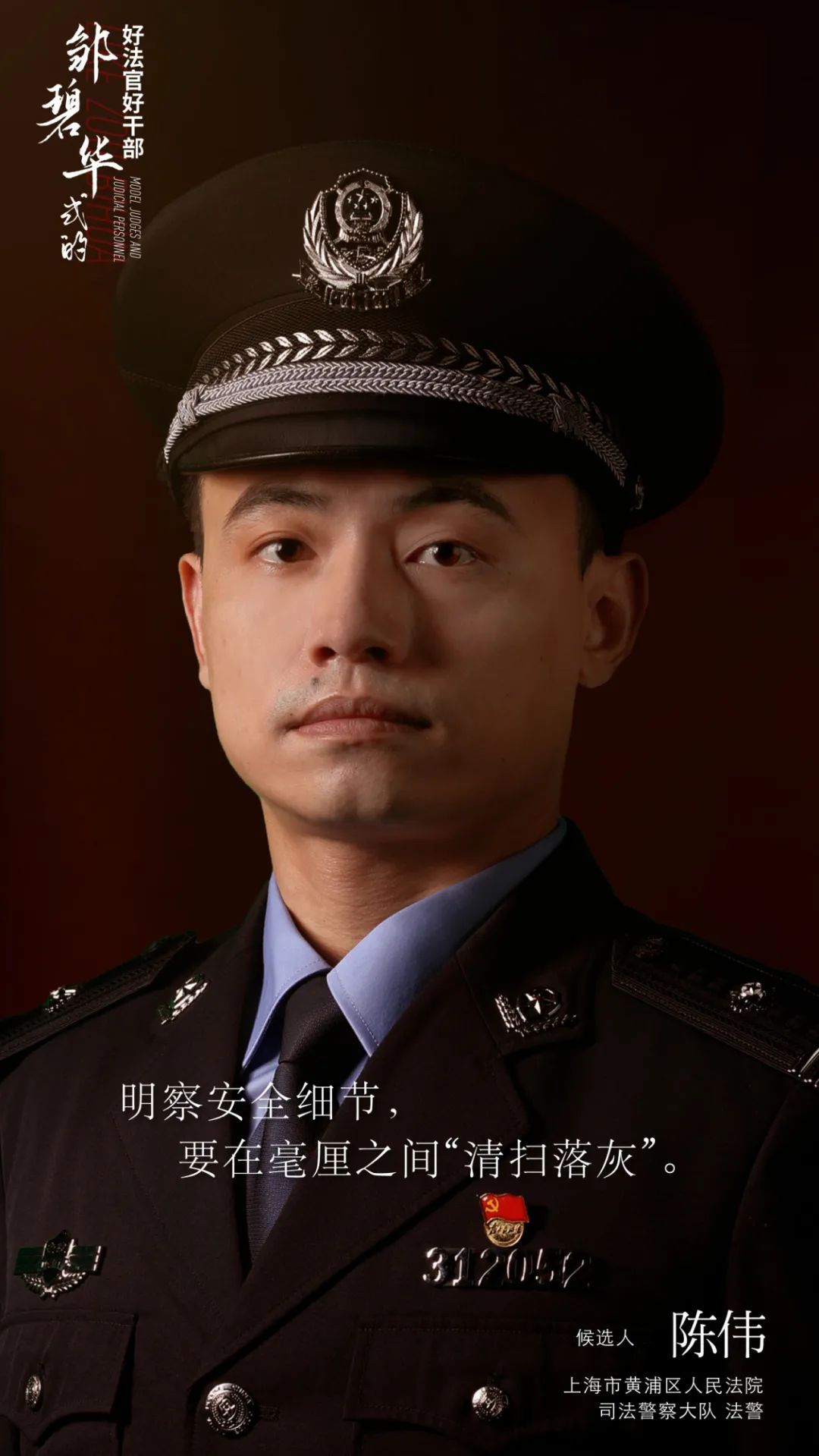 人民法院司法警察的工作大多是一些保障性的工作,出成绩看不见,出了问题就是大事,因此特别需要有情怀、有抱负,真正热爱警务工作的同志才能做好,而陈伟恰恰就是这样的人。正是因为有了这份热爱,他才能坚持琐碎、甘于平凡,将细小的工作干到极致。