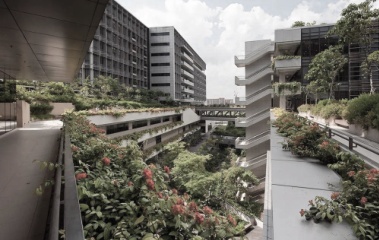 为了给各功能系统的使用者提供一个安全、优美、可调节身心健康的工作环境和活动场所,景观设计理念主要突出“以人为本”,结合绿化和水系的疗愈性景观设计,让使用者体会到原始森林的感觉,感受到欣欣向荣的生命力量。西侧绿化块区主要采用自然式布局,与南竹港相呼应,在山水之间为使用者提供良好的环境。