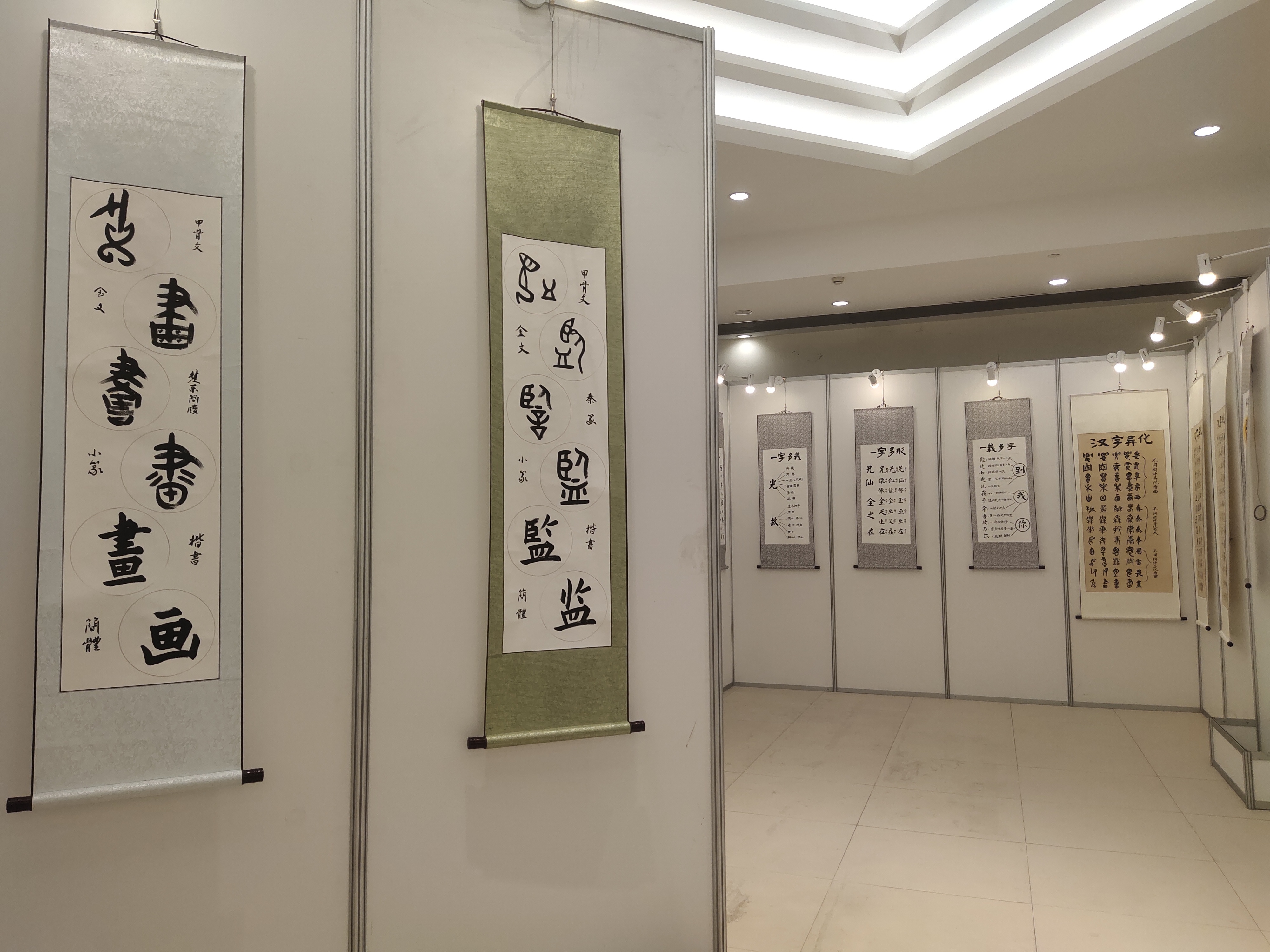 展览由“汉字字体的表现”“字形之变”和“汉字之美”三部分构成。高金平用甲骨文、金文、篆体、隶书、楷书、行书、草书七体创作的百余幅作品悉数陈展,书体发展的整体脉络由此被勾勒出来。在作品创作时,高金平还融入了汉字演变的技巧规律,以展现“字形之变”,用书法对汉字“异化”“讹变”等进行了细致而形象的描摹,观之直观而有趣。