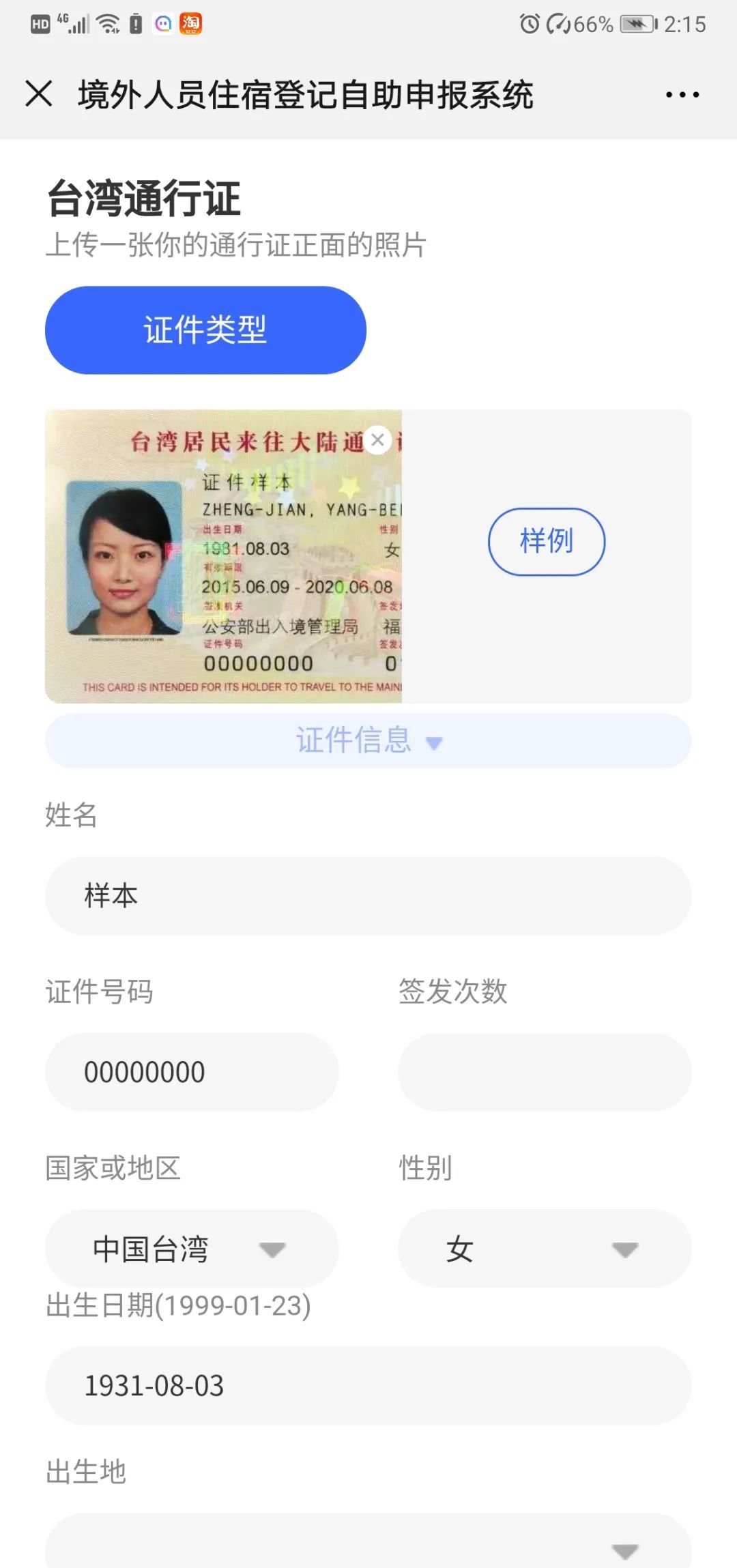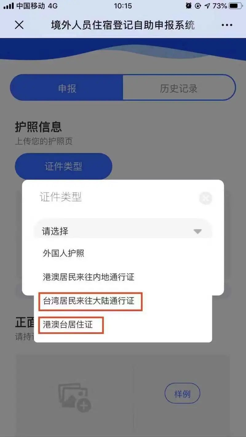 第二步,登录后选择证件类型,并上传证件照片(台胞证和港澳台居民居住证都可以哦!)