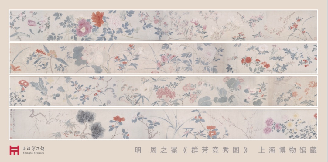 周之冕(1521—?)明代画家,《群芳竟秀图》卷,画四季花卉六十多种,均以折枝花的形式呈现。画面从右向左按照四季顺序来分布花卉品类,各个花枝俯仰有致、穿插自然。周之冕是晚明时期苏州著名的花鸟画家,善用勾勒法画花,以水墨或色彩点染叶子,画法兼工带写,人称“勾花点叶法”。所作花鸟,形象真实,意态生动。这卷画就是周之冕的代表作,勾勒与写意结合,设色精雅清丽。表达了四季有序、吉祥如意的美好寓意。