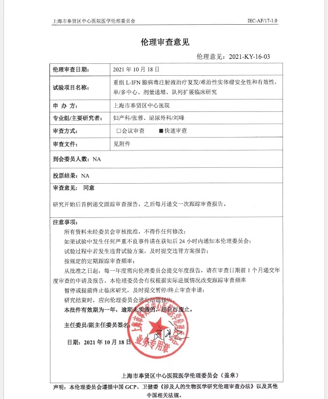 临床前研究数据表明,“重组L-IFN腺病毒注射液”在多种移植瘤模型上都具有十分优异的安全性和极其振奋的抗癌药效,如肺癌,膀胱癌,乳腺癌,头颈癌,卵巢癌,宫颈癌,黑色素瘤,神经胶质瘤等,具有显著的成药性和临床转化价值。
