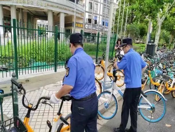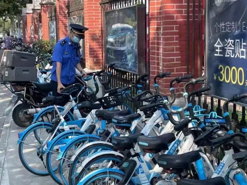清晨的街头,赶着上班的市民急着出行,一些市民将骑完的共享单车放在指定停放区域后离开。虽然在指定区域,但停放的共享单车比较混乱,“扫街”的城管队员将混乱的共享单车整理摆放整齐。