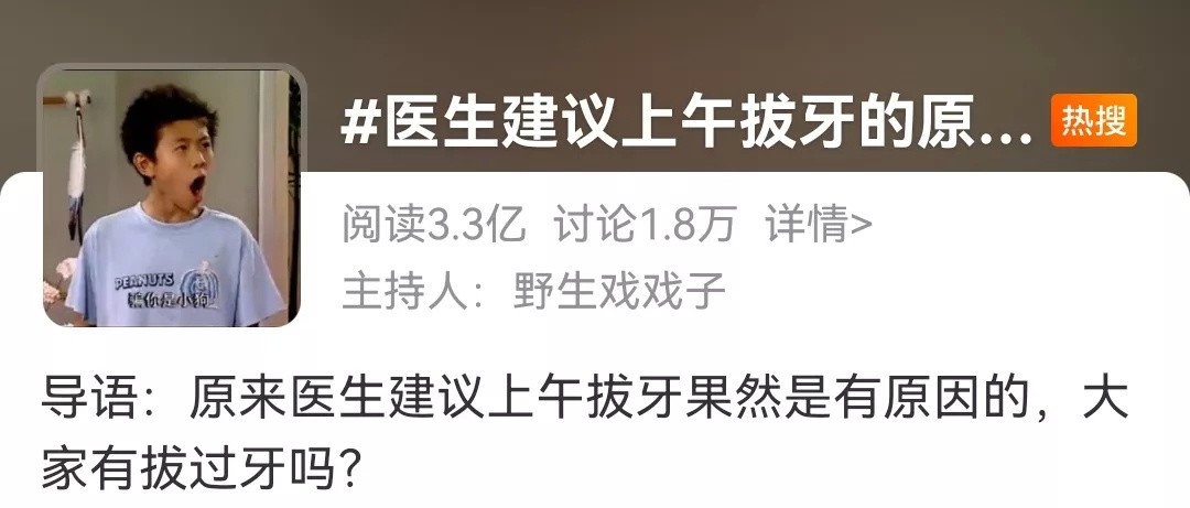 日前,网上有一条热搜,是关于“医生建议上午拔牙”的。为什么不建议下午拔牙,网友还总结出了几点原因: